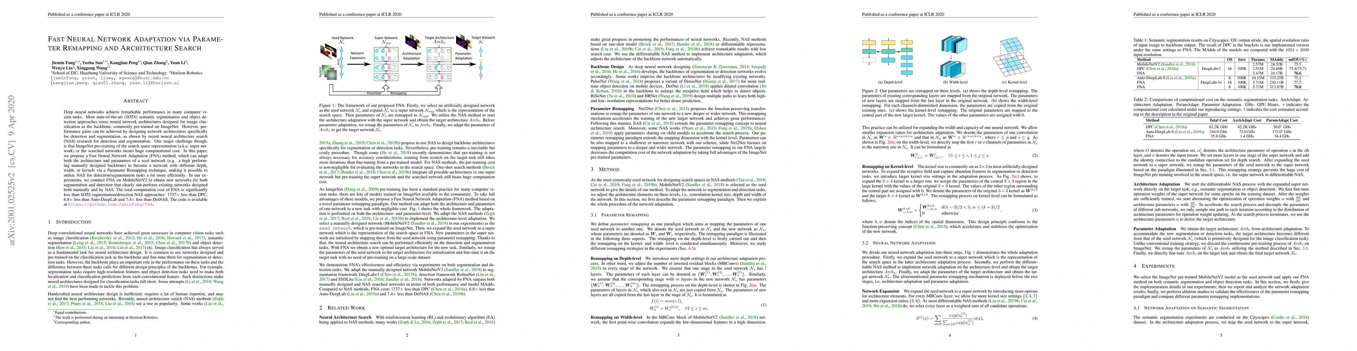 This paper proposes a Fast Neural Network Adaptation (FNA) method to efficiently adapt both the architecture and parameters of seed networks, achieving performance gains for detection and segmentation tasks. FNA uses Parameter Remapping to modify networks like MobileNetV2, significantly reducing computational costs compared to existing neural architecture search methods.