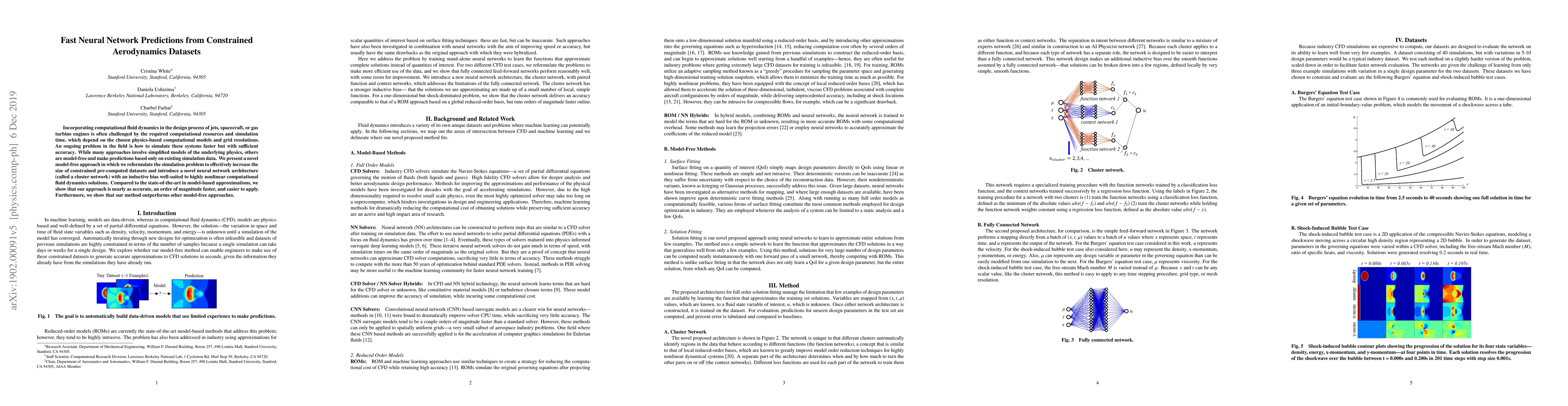 Incorporating computational fluid dynamics in the design process of jets, spacecraft, or gas turbine engines is often challenged by the required computational resources and simulation time, which depend on the chosen physics-based computational models and grid resolutions. An ongoing problem in the field is how to simulate these systems faster but with sufficient accuracy. While many approaches involve simplified models of the underlying physics, others are model-free and make predictions based only on existing simulation data. We present a novel model-free approach in which we reformulate the simulation problem to effectively increase the size of constrained pre-computed datasets and introduce a novel neural network architecture (called a cluster network) with an inductive bias well-suited to highly nonlinear computational fluid dynamics solutions. Compared to the state-of-the-art in model-based approximations, we show that our approach is nearly as accurate, an order of magnitude faster, and easier to apply. Furthermore, we show that our method outperforms other model-free approaches.