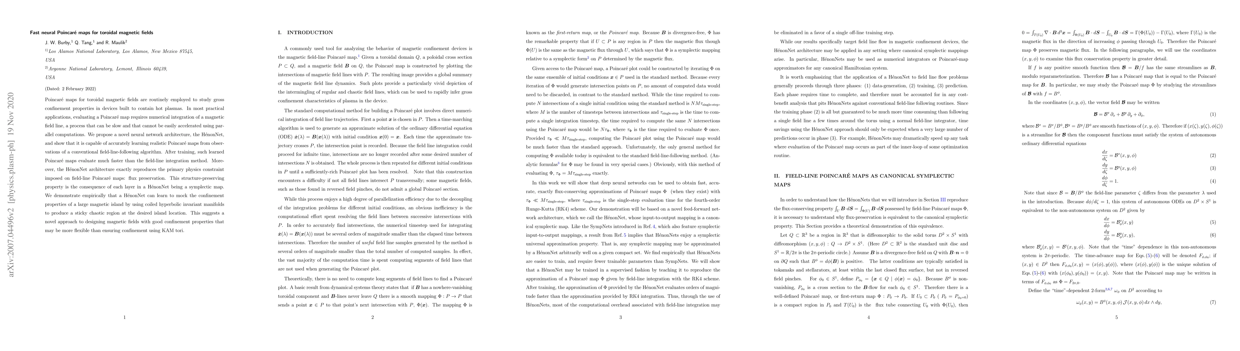 Poincar\'e maps for toroidal magnetic fields are routinely employed to study gross confinement properties in devices built to contain hot plasmas. In most practical applications, evaluating a Poincar\'e map requires numerical integration of a magnetic field line, a process that can be slow and that cannot be easily accelerated using parallel computations. We show that a novel neural network architecture, the H\'enonNet, is capable of accurately learning realistic Poincar\'e maps from observations of a conventional field-line-following algorithm. After training, such learned Poincar\'e maps evaluate much faster than the field-line integration method. Moreover, the H\'enonNet architecture exactly reproduces the primary physics constraint imposed on field-line Poincar\'e maps: flux preservation. This structure-preserving property is the consequence of each layer in a H\'enonNet being a symplectic map. We demonstrate empirically that a H\'enonNet can learn to mock the confinement properties of a large magnetic island by using coiled hyperbolic invariant manifolds to produce a sticky chaotic region at the desired island location. This suggests a novel approach to designing magnetic fields with good confinement properties that may be more flexible than ensuring confinement using KAM tori.