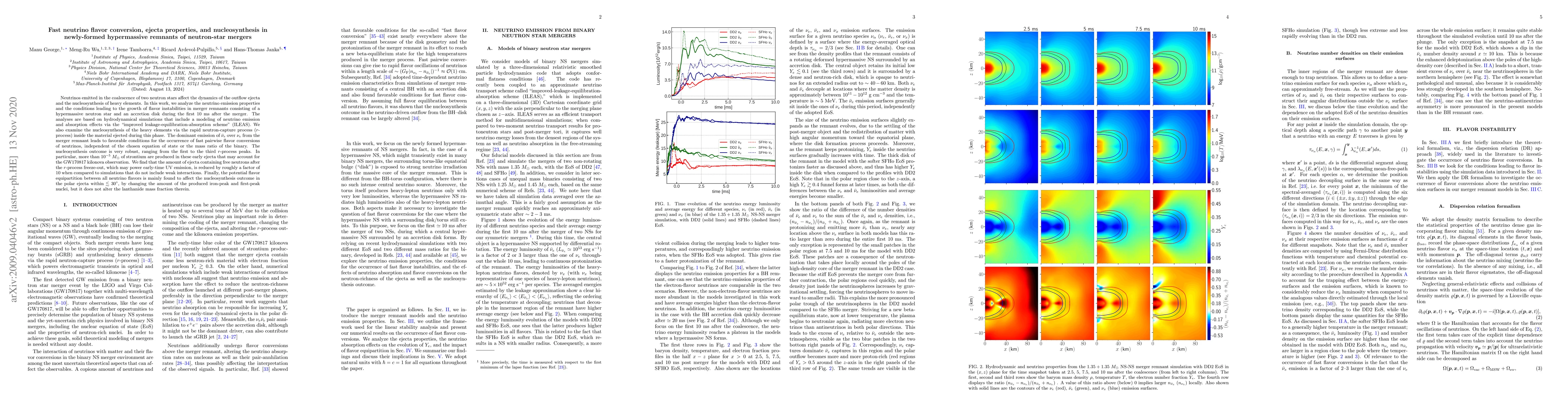 Neutrinos emitted in the coalescence of two neutron stars affect the dynamics of the outflow ejecta and the nucleosynthesis of heavy elements. In this work, we analyze the neutrino emission properties and the conditions leading to the growth of flavor instabilities in merger remnants consisting of a hypermassive neutron star and an accretion disk during the first 10 ms after the merger. The analyses are based on hydrodynamical simulations that include a modeling of neutrino emission and absorption effects via the "Improved Leakage-Equilibration-Absorption Scheme" (ILEAS). We also examine the nucleosynthesis of the heavy elements via the rapid neutron-capture process (r-process) inside the material ejected during this phase. The dominant emission of $\bar\nu_e$ over $\nu_e$ from the merger remnant leads to favorable conditions for the occurrence of fast pairwise flavor conversions of neutrinos, independent of the chosen equation of state or the mass ratio of the binary. The nucleosynthesis outcome is very robust, ranging from the first to the third r-process peaks. In particular, more than $10^{-5}$ $M_\odot$ of strontium are produced in these early ejecta that may account for the GW170817 kilonova observation. We find that the amount of ejecta containing free neutrons after the $r$-process freeze-out, which may power early-time UV emission, is reduced by roughly a factor of 10 when compared to simulations that do not include weak interactions. Finally, the potential flavor equipartition between all neutrino flavors is mainly found to affect the nucleosynthesis outcome in the polar ejecta within $\lesssim 30^\circ$, by changing the amount of the produced iron-peak and first-peak nuclei, but it does not alter the lanthanide mass fraction therein.