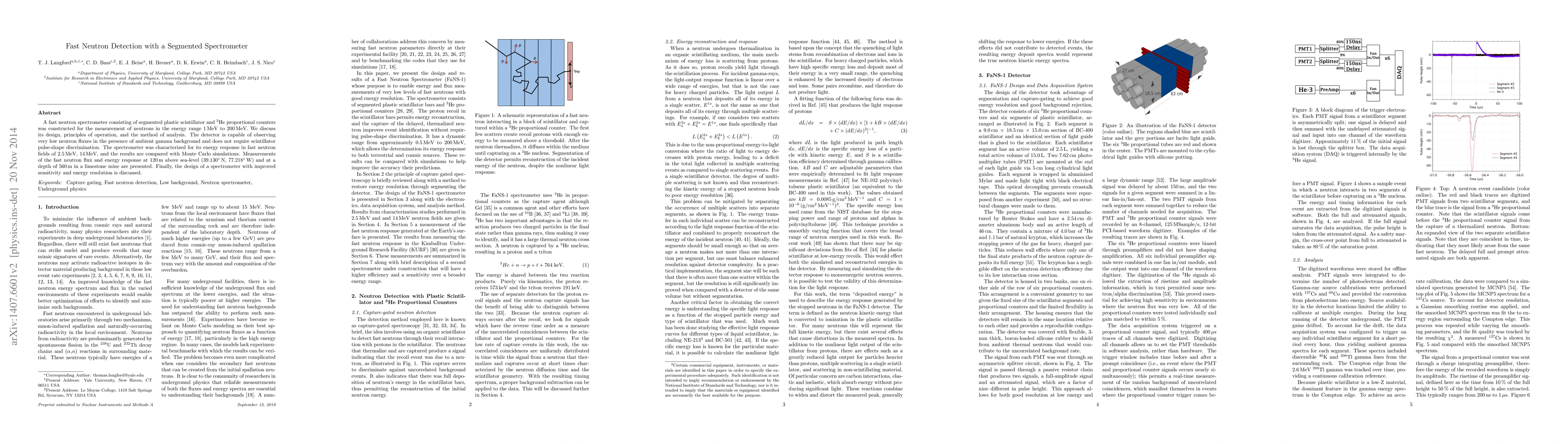 A fast neutron spectrometer consisting of segmented plastic scintillator and He-3 proportional counters was constructed for the measurement of neutrons in the energy range 1 MeV to 200 MeV. We discuss its design, principles of operation, and the method of analysis. The detector is capable of observing very low neutron fluxes in the presence of ambient gamma background and does not require scintillator pulseshape discrimination. The spectrometer was characterized for its energy response in fast neutron fields of 2.5 MeV and 14 MeV, and the results are compared with Monte Carlo simulations. Measurements of the fast neutron flux and energy response at 120 m above sea-level (39.130 deg. N, 77.218 deg. W) and at a depth of 560 m in a limestone mine are presented. Finally, the design of a spectrometer with improved sensitivity and energy resolution is discussed.