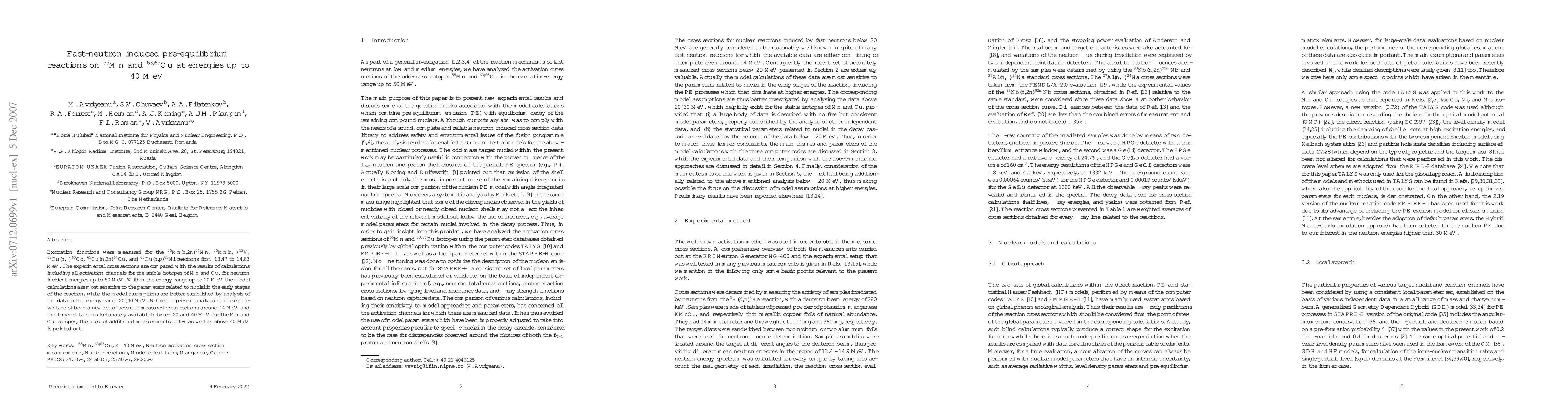 Excitation functions were measured for the $^{55}$Mn(n,2n)$^{54}$Mn, $^{55}$Mn(n,$\alpha$)$^{52}$V, $^{63}$Cu(n,$\alpha$)$^{60}$Co, $^{65}$Cu(n,2n)$^{64}$Cu, and $^{65}$Cu(n,p)$^{65}$Ni reactions from 13.47 to 14.83 MeV. The experimental cross sections are compared with the results of calculations including all activation channels for the stable isotopes of Mn and Cu, for neutron incident energies up to 50 MeV. Within the energy range up to 20 MeV the model calculations are most sensitive to the parameters related to nuclei in the early stages of the reaction, while the model assumptions are better established by analysis of the data in the energy range 20-40 MeV. While the present analysis has taken advantage of both a new set of accurate measured cross sections around 14 MeV and the larger data basis fortunately available between 20 and 40 MeV for the Mn and Cu isotopes, the need of additional measurements below as well as above 40 MeV is pointed out. Keywords: 55Mn, 63,65Cu, E$\leq$40 MeV, Neutron activation cross section measurements, Nuclear reactions, Model calculations, Manganese, Copper