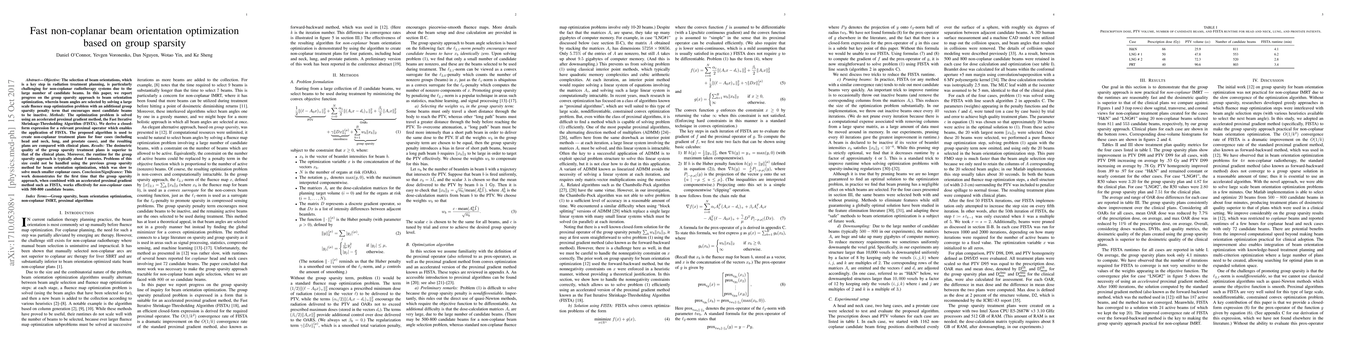 This paper presents a group sparsity approach for optimizing non-coplanar beam orientations in radiation treatment planning, solved using the Fast Iterative Shrinkage-Thresholding Algorithm (FISTA). The method significantly improves dosimetric quality and reduces runtime compared to clinical plans.