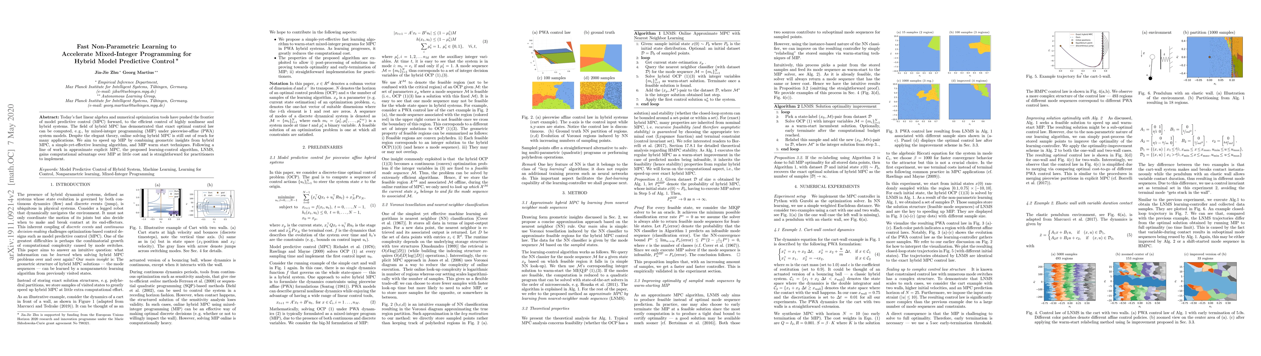 This paper proposes a fast non-parametric learning algorithm, LNMS, to accelerate mixed-integer programming for online hybrid model predictive control, aiming to bridge the gap between theory and practical application. The method leverages geometric insights and MIP warm start techniques to achieve significant speedups with minimal loss in accuracy.