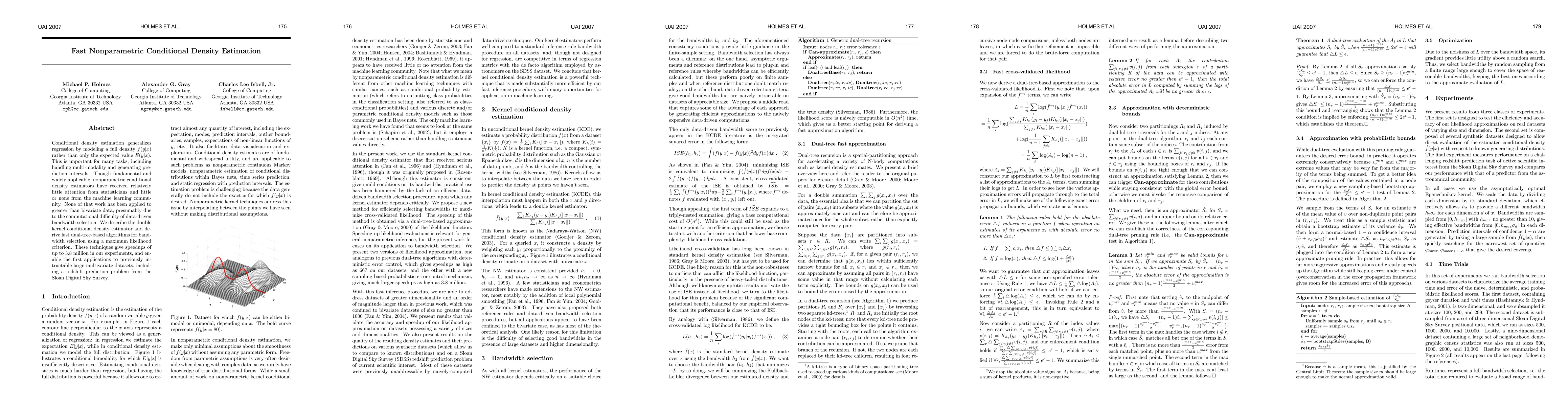 Conditional density estimation generalizes regression by modeling a full density f(yjx) rather than only the expected value E(yjx). This is important for many tasks, including handling multi-modality and generating prediction intervals. Though fundamental and widely applicable, nonparametric conditional density estimators have received relatively little attention from statisticians and little or none from the machine learning community. None of that work has been applied to greater than bivariate data, presumably due to the computational difficulty of data-driven bandwidth selection. We describe the double kernel conditional density estimator and derive fast dual-tree-based algorithms for bandwidth selection using a maximum likelihood criterion. These techniques give speedups of up to 3.8 million in our experiments, and enable the first applications to previously intractable large multivariate datasets, including a redshift prediction problem from the Sloan Digital Sky Survey.