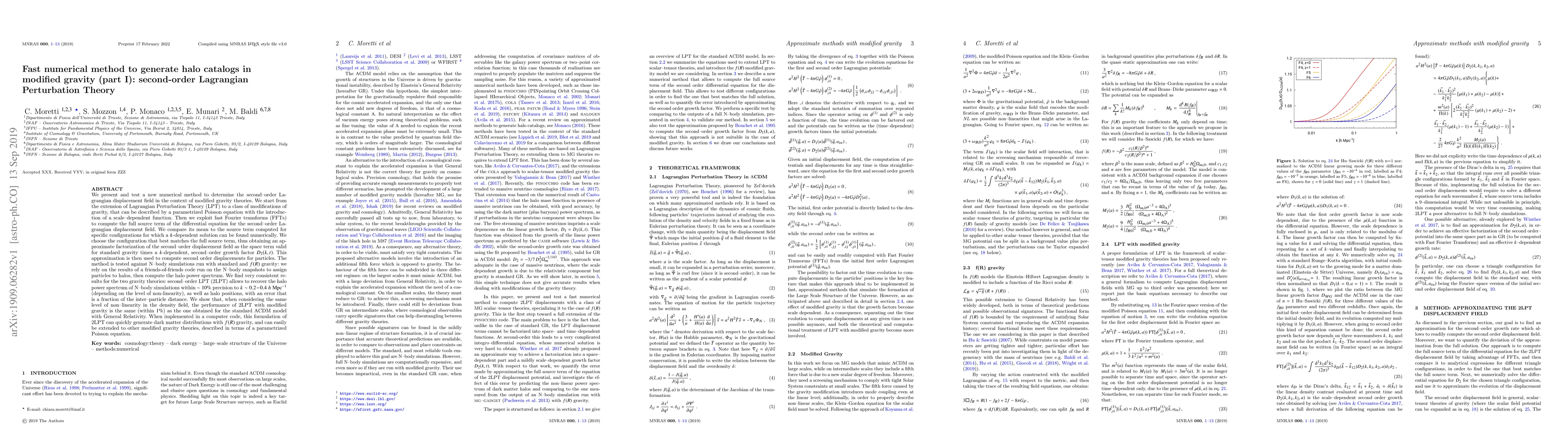 This paper introduces a fast numerical method based on second-order Lagrangian Perturbation Theory (2LPT) to generate halo catalogs in modified gravity (MG) models. The method approximates the second-order Lagrangian displacement field with a k-dependent growth factor, achieving $\sim 10\%$ precision in halo power spectrum and positions compared to N-body simulations, comparable to the standard $\Lambda$CDM model.