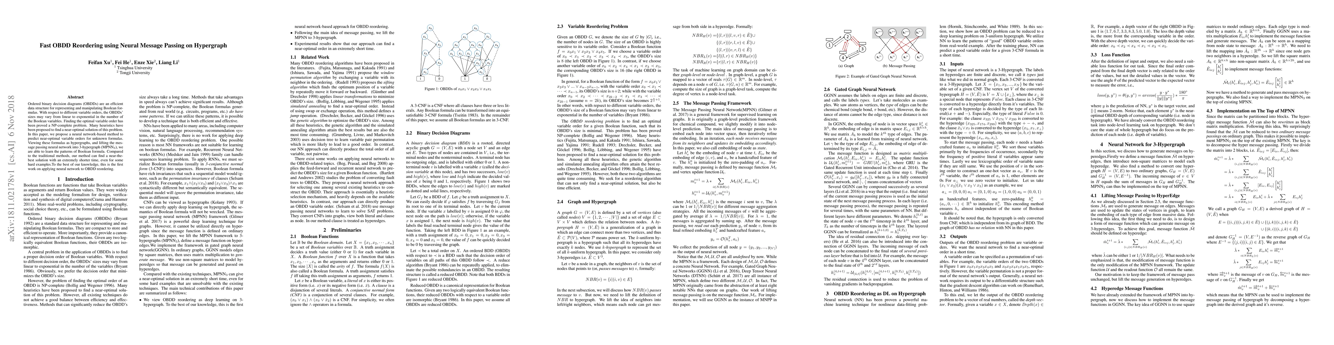 Ordered binary decision diagrams (OBDDs) are an efficient data structure for representing and manipulating Boolean formulas. With respect to different variable orders, the OBDDs' sizes may vary from linear to exponential in the number of the Boolean variables. Finding the optimal variable order has been proved a NP-complete problem. Many heuristics have been proposed to find a near-optimal solution of this problem. In this paper, we propose a neural network-based method to predict near-optimal variable orders for unknown formulas. Viewing these formulas as hypergraphs, and lifting the message passing neural network into 3-hypergraph (MPNN3), we are able to learn the patterns of Boolean formula. Compared to the traditional methods, our method can find a near-the-best solution with an extremely shorter time, even for some hard examples.To the best of our knowledge, this is the first work on applying neural network to OBDD reordering.