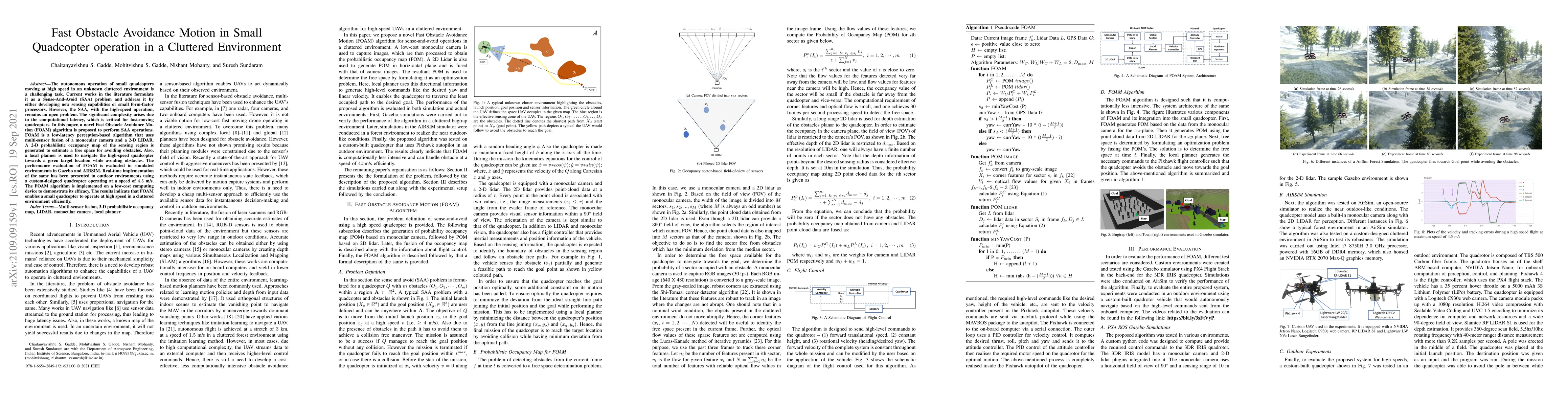 The autonomous operation of small quadcopters moving at high speed in an unknown cluttered environment is a challenging task. Current works in the literature formulate it as a Sense-And-Avoid (SAA) problem and address it by either developing new sensing capabilities or small form-factor processors. However, the SAA, with the high-speed operation, remains an open problem. The significant complexity arises due to the computational latency, which is critical for fast-moving quadcopters. In this paper, a novel Fast Obstacle Avoidance Motion (FOAM) algorithm is proposed to perform SAA operations. FOAM is a low-latency perception-based algorithm that uses multi-sensor fusion of a monocular camera and a 2-D LIDAR. A 2-D probabilistic occupancy map of the sensing region is generated to estimate a free space for avoiding obstacles. Also, a local planner is used to navigate the high-speed quadcopter towards a given target location while avoiding obstacles. The performance evaluation of FOAM is evaluated in simulated environments in Gazebo and AIRSIM. Real-time implementation of the same has been presented in outdoor environments using a custom-designed quadcopter operating at a speed of $4.5$ m/s. The FOAM algorithm is implemented on a low-cost computing device to demonstrate its efficacy. The results indicate that FOAM enables a small quadcopter to operate at high speed in a cluttered environment efficiently.