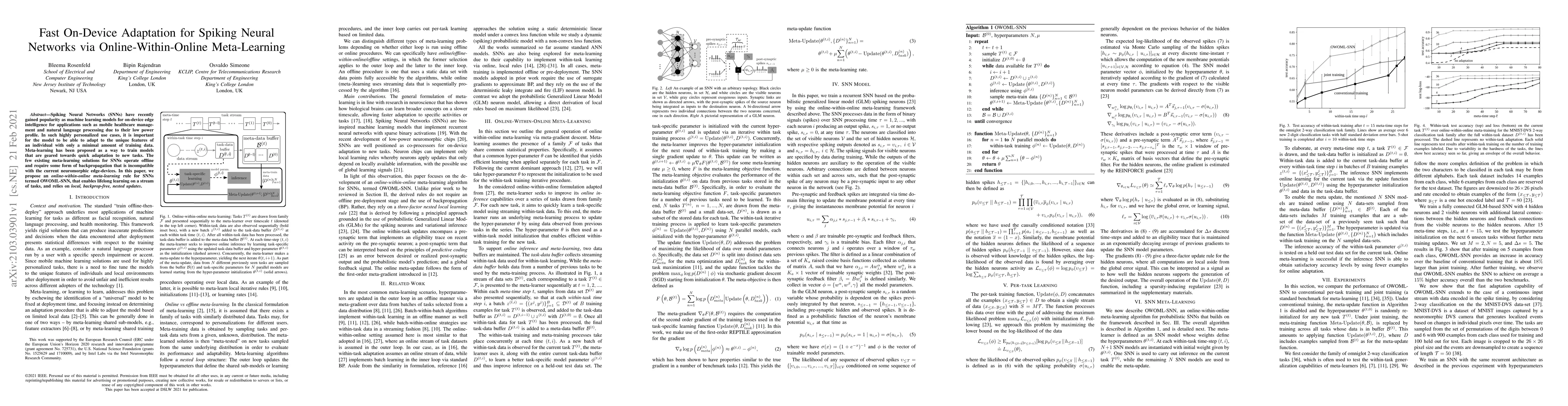 This paper proposes an online-within-online meta-learning rule, OWOML-SNN, for Spiking Neural Networks to enable fast on-device adaptation without backpropagation, facilitating lifelong learning for personalized edge intelligence applications.