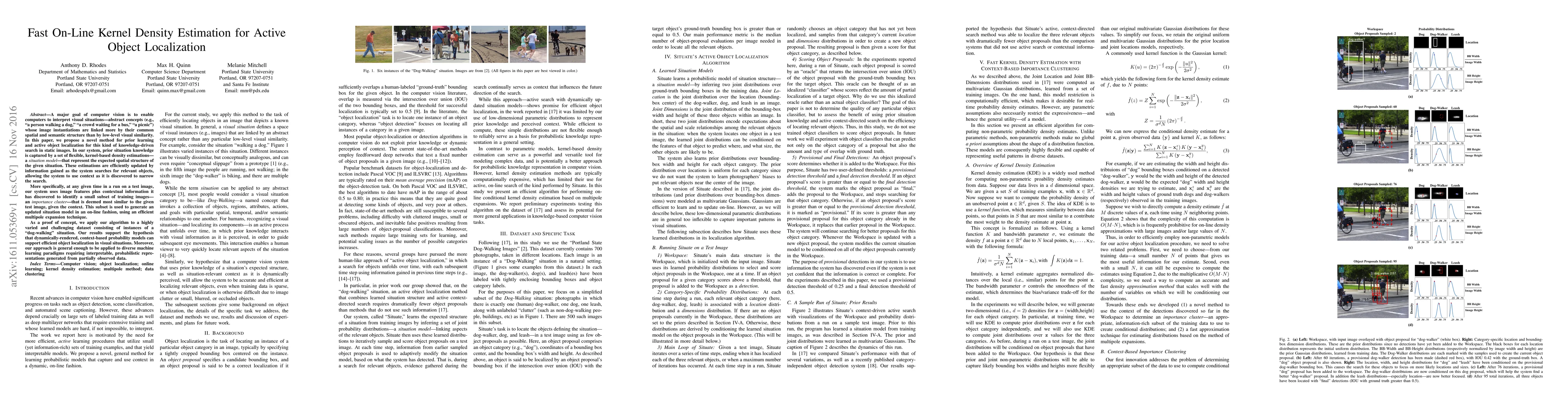 This paper proposes a novel method for active object localization using kernel density estimation to update situation models based on discovered context. The method efficiently identifies relevant training images to generate updated situation models, demonstrating effectiveness in a "dog-walking" scenario.