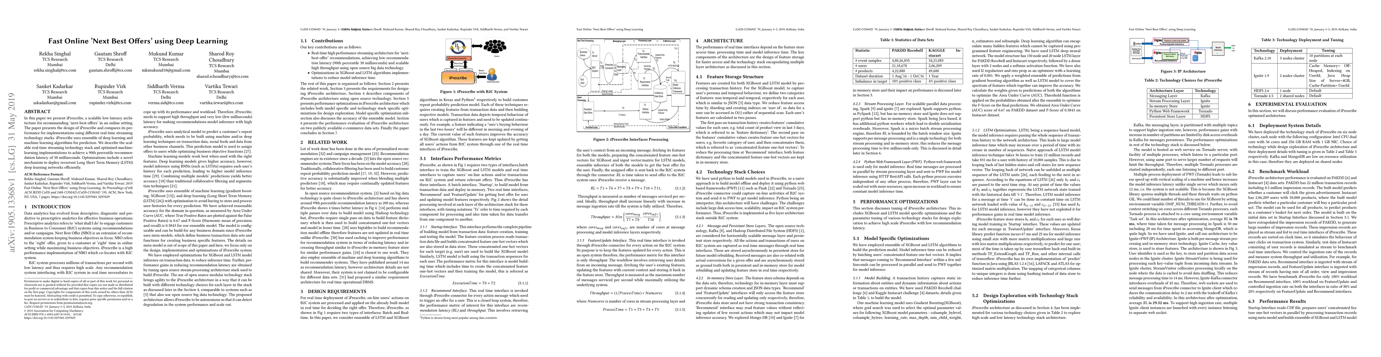 Summary: iPrescribe is a low-latency system for recommending "next-best-offers" in real-time online settings using deep learning and machine learning algorithms, achieving a 90th percentile recommendation latency of 38 milliseconds. The system employs a scalable real-time streaming architecture and optimizes recurrent LSTM networks for efficiency.
