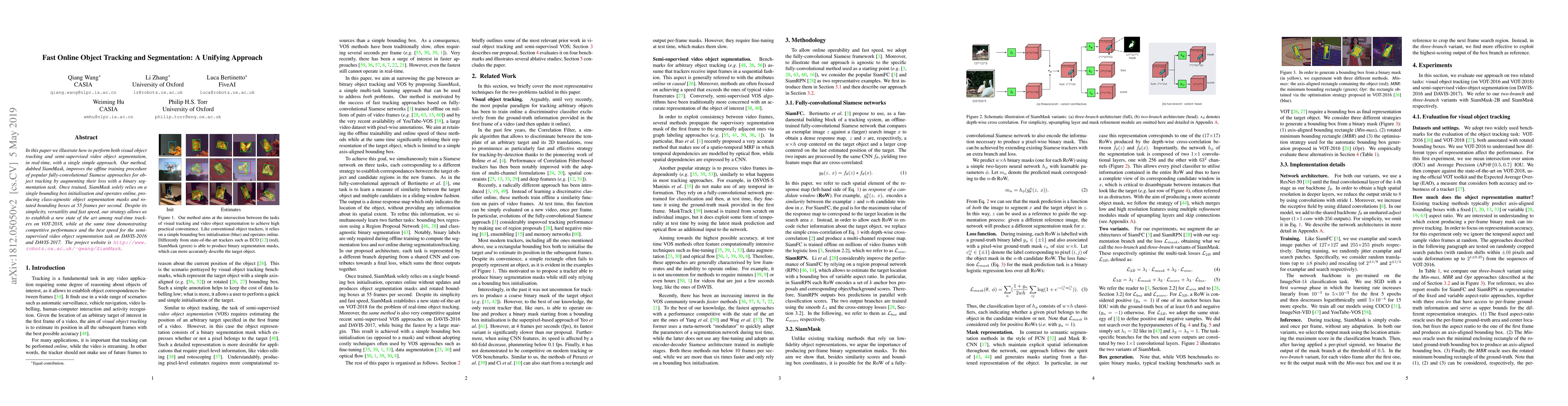 This paper presents SiamMask, a unified approach for real-time visual object tracking and semi-supervised video object segmentation, achieving state-of-the-art performance on VOT-2018 and DAVIS benchmarks. The method enhances traditional Siamese networks by incorporating a binary segmentation task during training.