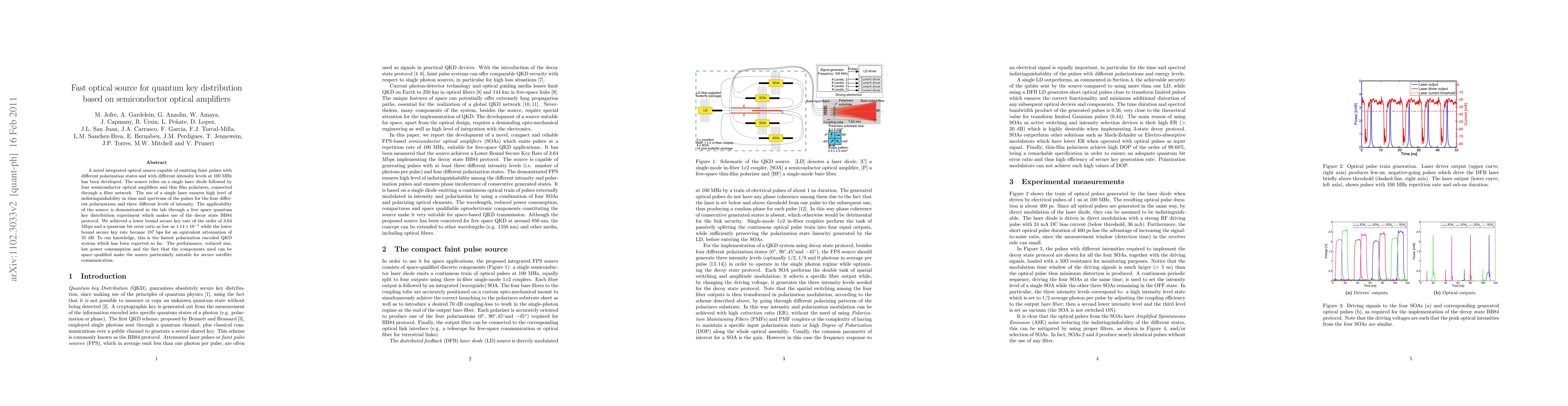 This paper presents a novel integrated optical source for quantum key distribution (QKD) using semiconductor optical amplifiers, achieving a secure key rate of 3.64 Mbps and a low quantum bit error ratio. The system's compact design and space-qualified components make it suitable for secure satellite communication.