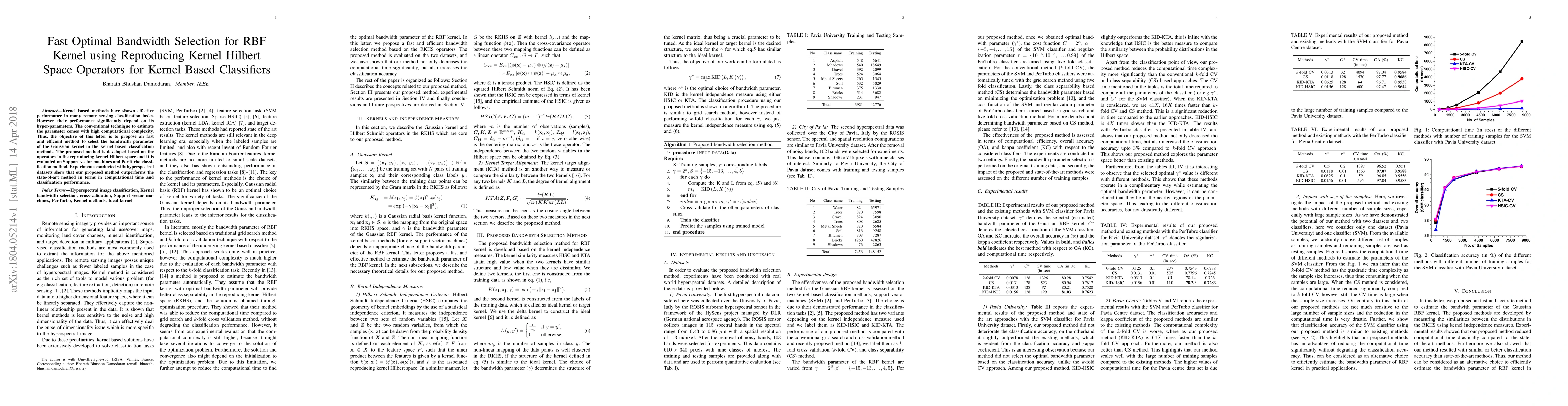 Kernel based methods have shown effective performance in many remote sensing classification tasks. However their performance significantly depend on its hyper-parameters. The conventional technique to estimate the parameter comes with high computational complexity. Thus, the objective of this letter is to propose an fast and efficient method to select the bandwidth parameter of the Gaussian kernel in the kernel based classification methods. The proposed method is developed based on the operators in the reproducing kernel Hilbert space and it is evaluated on Support vector machines and PerTurbo classification method. Experiments conducted with hyperspectral datasets show that our proposed method outperforms the state-of-art method in terms in computational time and classification performance.