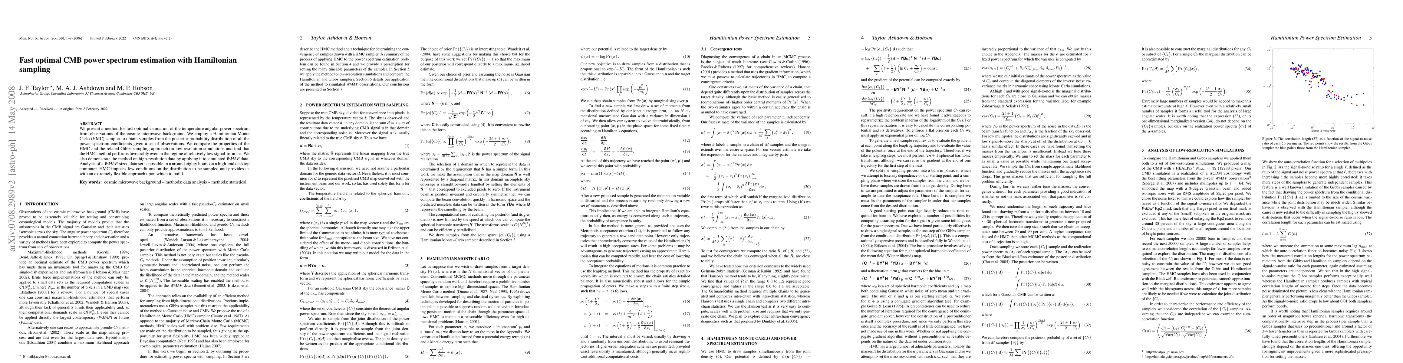 This paper introduces a Hamiltonian Monte Carlo (HMC) sampler for fast and optimal estimation of the cosmic microwave background's temperature angular power spectrum. The HMC method outperforms Gibbs sampling in low signal-to-noise scenarios and efficiently analyzes WMAP-sized data within eighty hours on a high-end desktop.