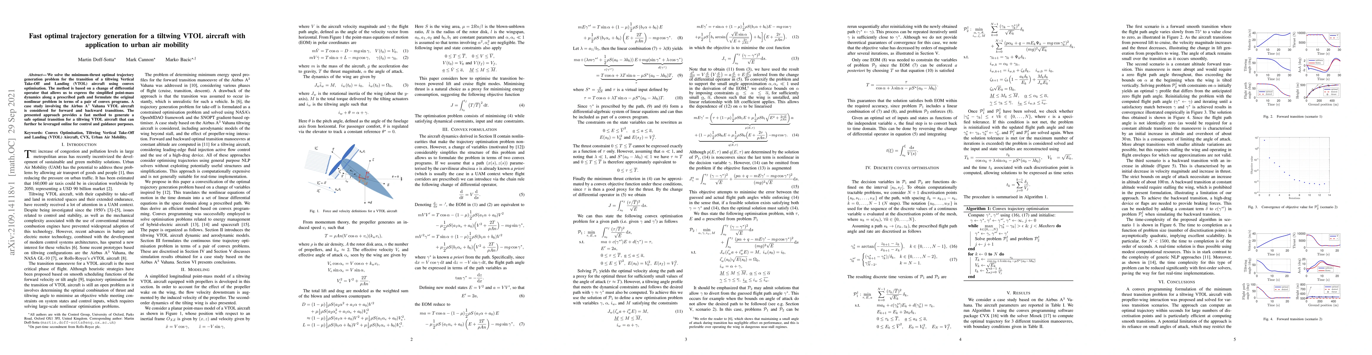 This research presents a convex optimization method for generating optimal, minimum-thrust trajectories for tiltwing VTOL aircraft during urban air mobility transitions. The method transforms the nonlinear problem into a pair of convex programs, enabling safe and efficient online control and guidance.