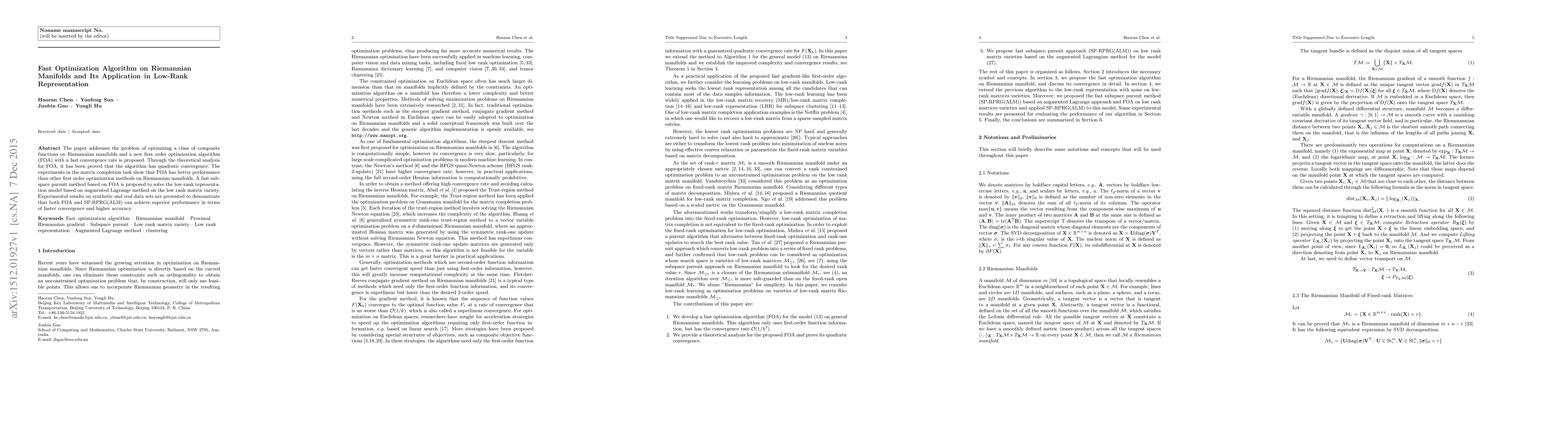 This paper introduces a novel first-order optimization algorithm (FOA) for fast convergence on Riemannian manifolds, demonstrating quadratic convergence theoretically. It applies FOA to low-rank representation, achieving superior performance in matrix completion tasks compared to other methods.