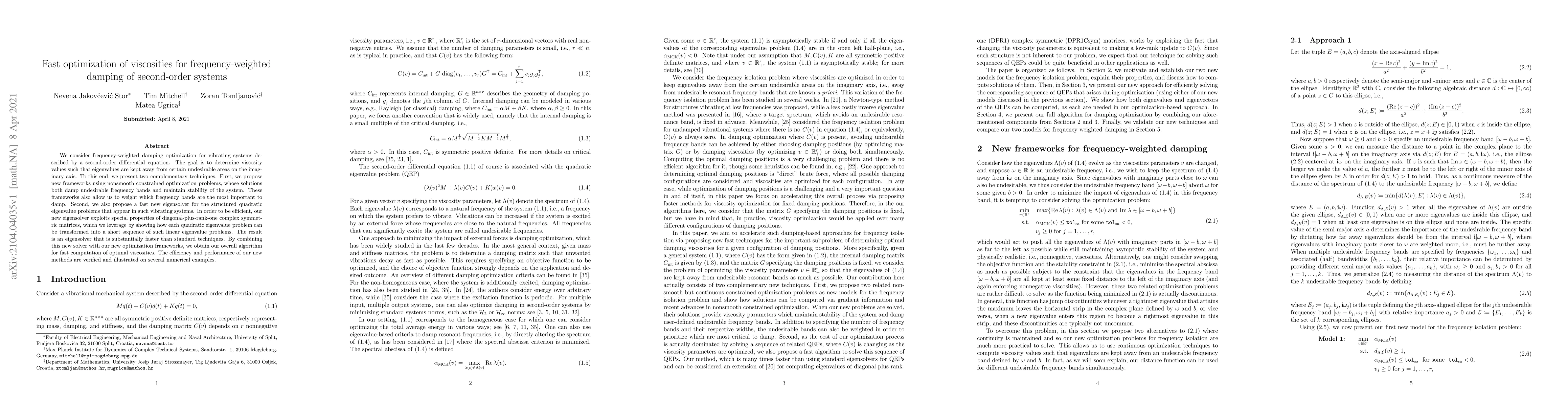 We consider frequency-weighted damping optimization for vibrating systems described by a second-order differential equation. The goal is to determine viscosity values such that eigenvalues are kept away from certain undesirable areas on the imaginary axis. To this end, we present two complementary techniques. First, we propose new frameworks using nonsmooth constrained optimization problems, whose solutions both damp undesirable frequency bands and maintain stability of the system. These frameworks also allow us to weight which frequency bands are the most important to damp. Second, we also propose a fast new eigensolver for the structured quadratic eigenvalue problems that appear in such vibrating systems. In order to be efficient, our new eigensolver exploits special properties of diagonal-plus-rank-one complex symmetric matrices, which we leverage by showing how each quadratic eigenvalue problem can be transformed into a short sequence of such linear eigenvalue problems. The result is an eigensolver that is substantially faster than standard techniques. By combining this new solver with our new optimization frameworks, we obtain our overall algorithm for fast computation of optimal viscosities. The efficiency and performance of our new methods are verified and illustrated on several numerical examples.