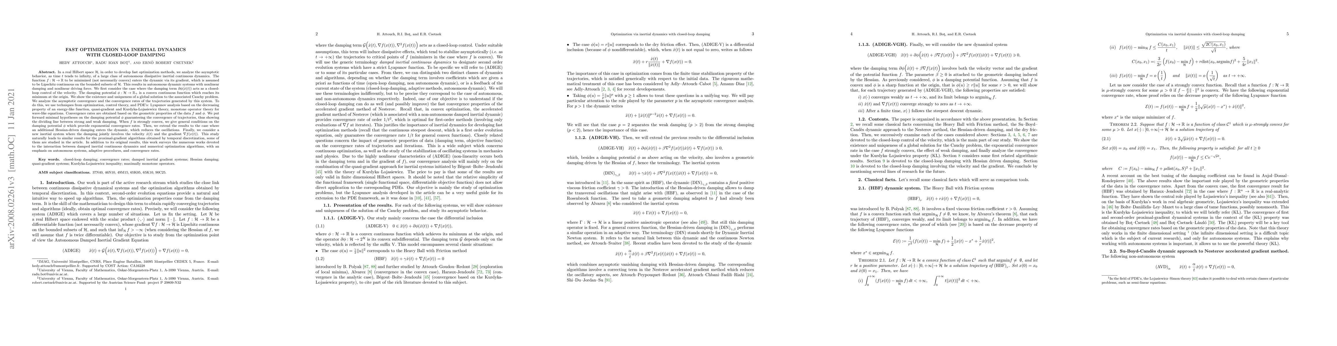 This paper investigates fast optimization methods via inertial dynamics with closed-loop damping in a Hilbert space, focusing on the asymptotic behavior of the system. It establishes the existence and uniqueness of global solutions and analyzes convergence properties using optimization, control theory, and PDE techniques, achieving exponential convergence rates under strong convexity.