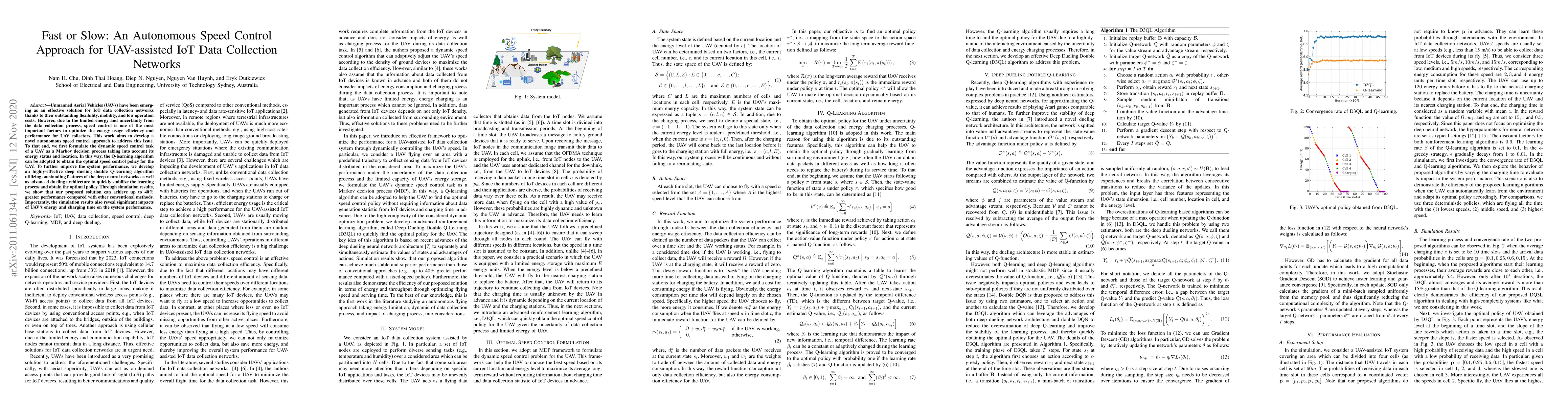 This paper proposes an autonomous speed control approach for UAVs in IoT data collection networks, formulated as a Markov decision process. The deep dueling double Q-learning algorithm is developed to optimize UAV speed, achieving up to 40% better performance than conventional methods, highlighting the importance of energy and charging time.