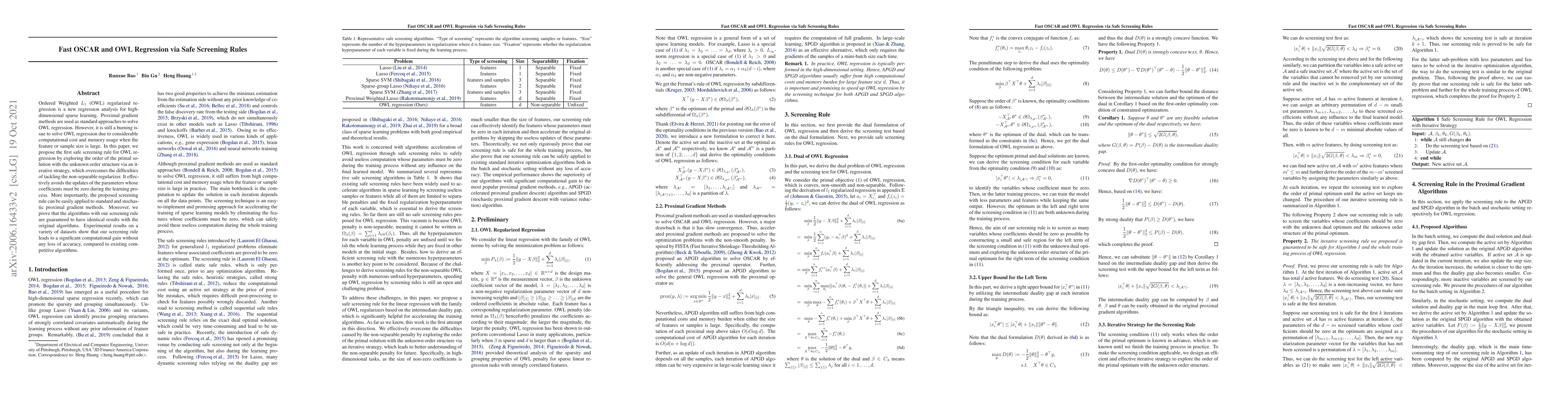 This paper proposes a safe screening rule for Ordered Weighted $L_{1}$ (OWL) regression to reduce computational costs and memory usage in high-dimensional sparse learning. The screening rule effectively avoids unnecessary parameter updates, leading to significant computational gains without sacrificing accuracy.