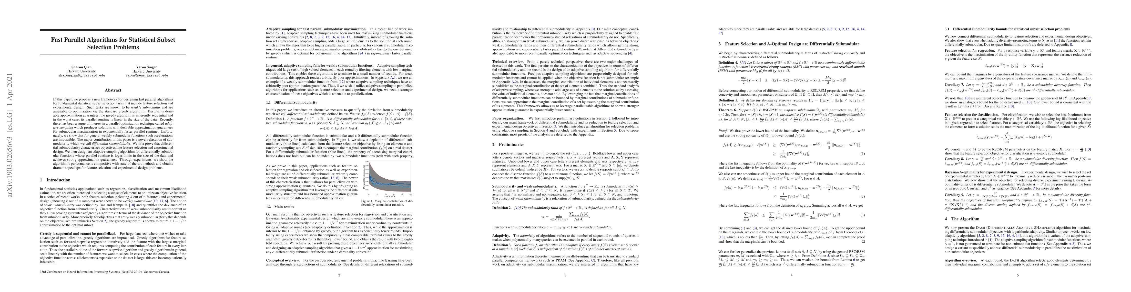 In this paper, we propose a new framework for designing fast parallel algorithms for fundamental statistical subset selection tasks that include feature selection and experimental design. Such tasks are known to be weakly submodular and are amenable to optimization via the standard greedy algorithm. Despite its desirable approximation guarantees, the greedy algorithm is inherently sequential and in the worst case, its parallel runtime is linear in the size of the data. Recently, there has been a surge of interest in a parallel optimization technique called adaptive sampling which produces solutions with desirable approximation guarantees for submodular maximization in exponentially faster parallel runtime. Unfortunately, we show that for general weakly submodular functions such accelerations are impossible. The major contribution in this paper is a novel relaxation of submodularity which we call differential submodularity. We first prove that differential submodularity characterizes objectives like feature selection and experimental design. We then design an adaptive sampling algorithm for differentially submodular functions whose parallel runtime is logarithmic in the size of the data and achieves strong approximation guarantees. Through experiments, we show the algorithm's performance is competitive with state-of-the-art methods and obtains dramatic speedups for feature selection and experimental design problems.