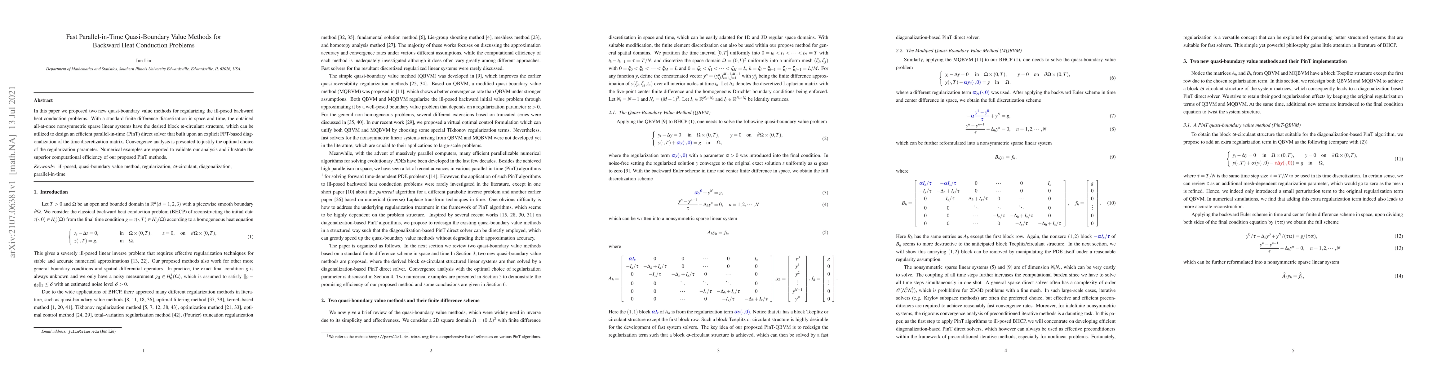 This paper introduces two quasi-boundary value methods for solving ill-posed backward heat conduction problems, utilizing a parallel-in-time direct solver based on FFT-diagonalization. The proposed methods achieve efficient regularization and demonstrate superior computational efficiency through numerical validation.