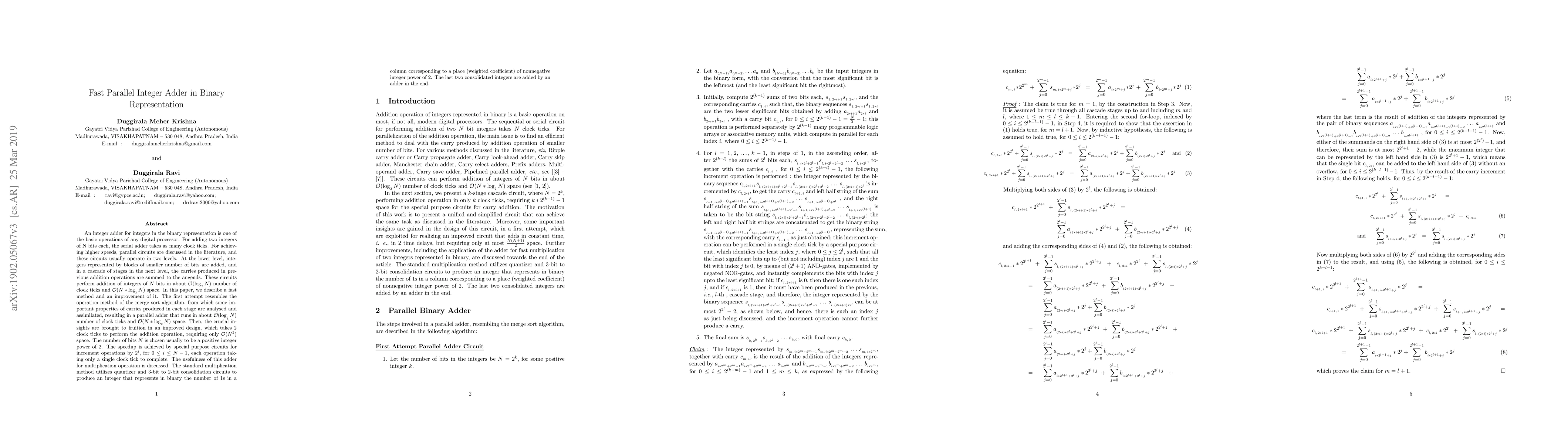 Researchers propose a fast parallel integer adder that performs addition in 2 clock ticks for N-bit integers, utilizing special purpose circuits and achieving O(square(N)) space complexity.