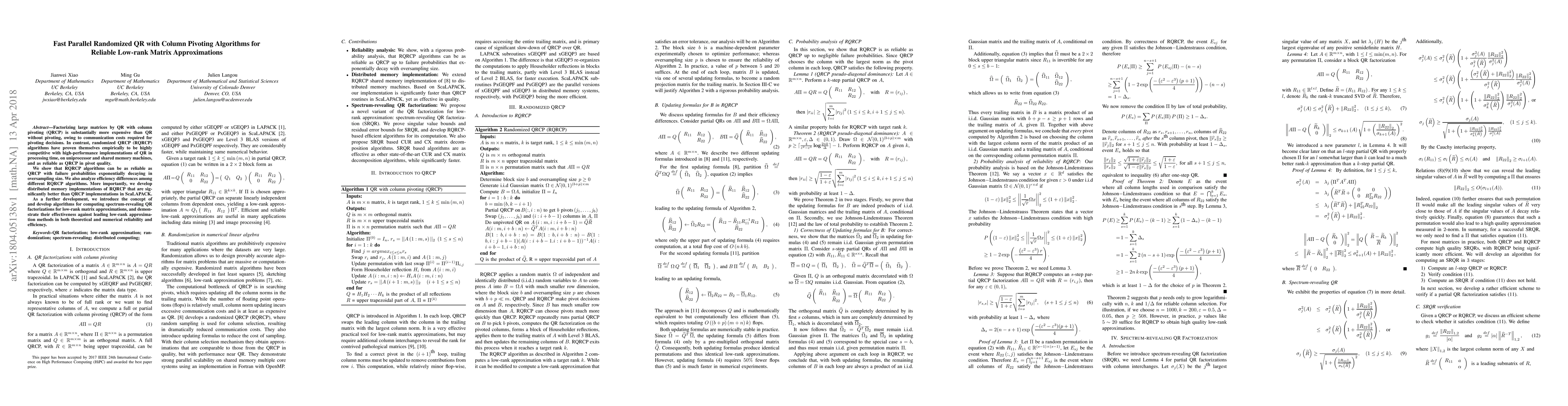 This paper presents randomized QR with column pivoting algorithms for efficient low-rank matrix approximations, showing they are reliable with exponentially decreasing failure probabilities. The study also develops distributed memory implementations that outperform traditional QRCP in ScaLAPACK and introduces spectrum-revealing QR factorizations for enhanced low-rank approximations.