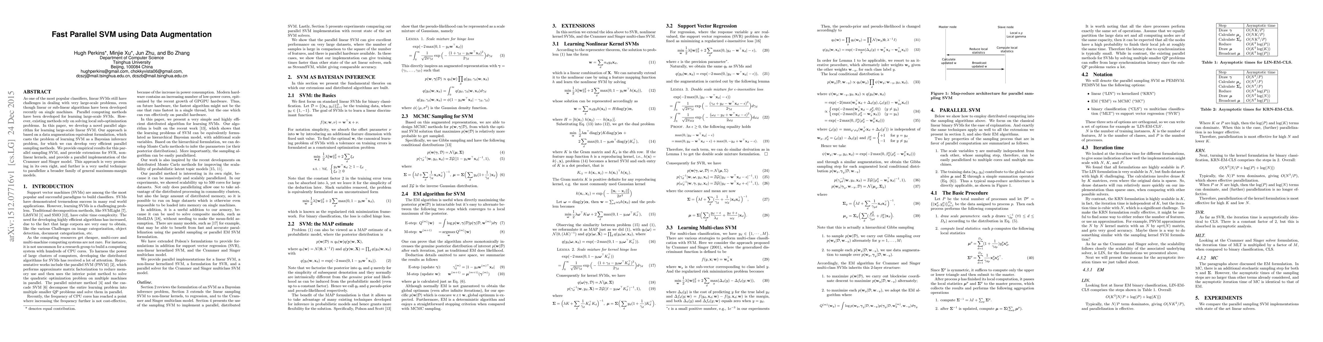 As one of the most popular classifiers, linear SVMs still have challenges in dealing with very large-scale problems, even though linear or sub-linear algorithms have been developed recently on single machines. Parallel computing methods have been developed for learning large-scale SVMs. However, existing methods rely on solving local sub-optimization problems. In this paper, we develop a novel parallel algorithm for learning large-scale linear SVM. Our approach is based on a data augmentation equivalent formulation, which casts the problem of learning SVM as a Bayesian inference problem, for which we can develop very efficient parallel sampling methods. We provide empirical results for this parallel sampling SVM, and provide extensions for SVR, non-linear kernels, and provide a parallel implementation of the Crammer and Singer model. This approach is very promising in its own right, and further is a very useful technique to parallelize a broader family of general maximum-margin models.