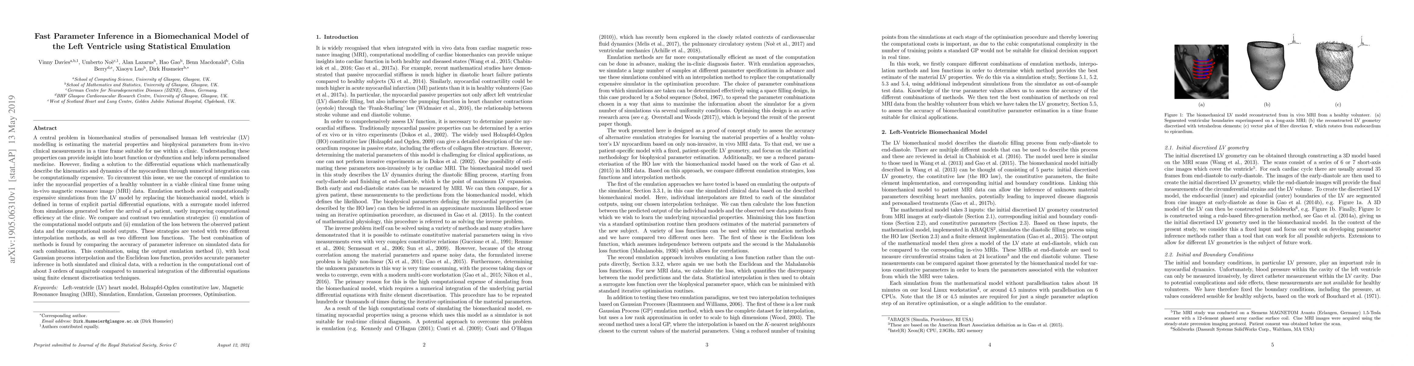 A central problem in biomechanical studies of personalised human left ventricular (LV) modelling is estimating the material properties and biophysical parameters from in-vivo clinical measurements in a time frame suitable for use within a clinic. Understanding these properties can provide insight into heart function or dysfunction and help inform personalised medicine. However, finding a solution to the differential equations which mathematically describe the kinematics and dynamics of the myocardium through numerical integration can be computationally expensive. To circumvent this issue, we use the concept of emulation to infer the myocardial properties of a healthy volunteer in a viable clinical time frame using in-vivo magnetic resonance image (MRI) data. Emulation methods avoid computationally expensive simulations from the LV model by replacing the biomechanical model, which is defined in terms of explicit partial differential equations, with a surrogate model inferred from simulations generated before the arrival of a patient, vastly improving computational efficiency at the clinic. We compare and contrast two emulation strategies: (i) emulation of the computational model outputs and (ii) emulation of the loss between the observed patient data and the computational model outputs. These strategies are tested with two different interpolation methods, as well as two different loss functions...