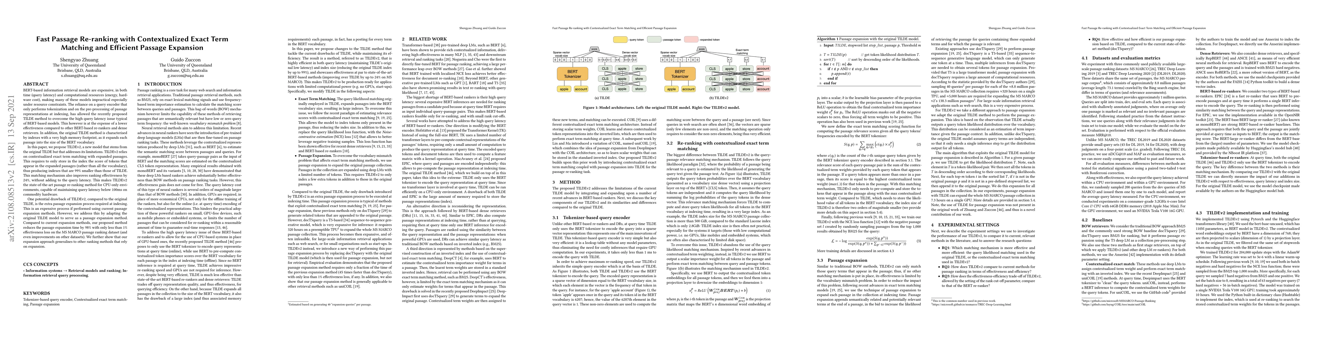 This paper proposes TILDEv2, an improved version of the TILDE model for fast passage re-ranking, which uses contextualized exact term matching and efficient passage expansion to reduce memory usage by 99% while improving ranking effectiveness by 24%, maintaining query latency below 100ms.