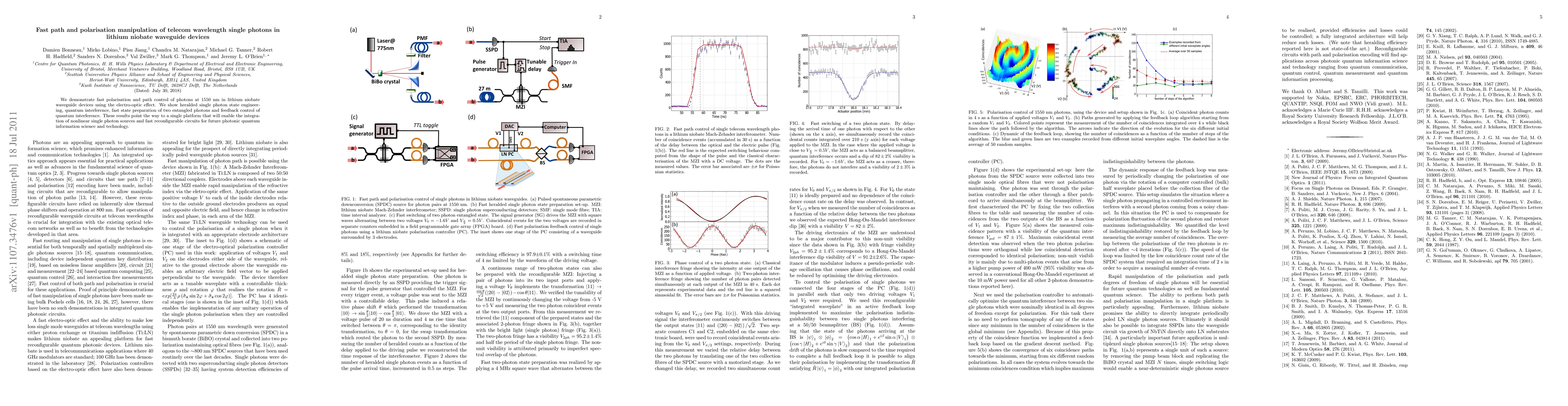 We demonstrate fast polarisation and path control of photons at 1550 nm in lithium niobate waveguide devices using the electro-optic effect. We show heralded single photon state engineering, quantum interference, fast state preparation of two entangled photons and feedback control of quantum interference. These results point the way to a single platform that will enable the integration of nonlinear single photon sources and fast reconfigurable circuits for future photonic quantum information science and technology.