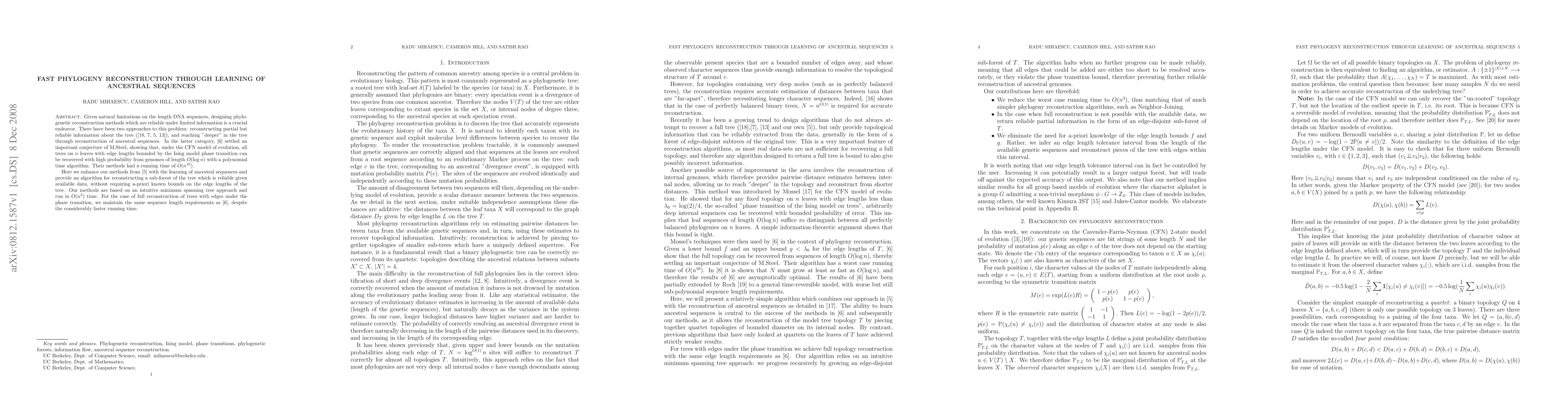 Given natural limitations on the length DNA sequences, designing phylogenetic reconstruction methods which are reliable under limited information is a crucial endeavor. There have been two approaches to this problem: reconstructing partial but reliable information about the tree (\cite{Mo07, DMR08,DHJ06,GMS08}), and reaching "deeper" in the tree through reconstruction of ancestral sequences. In the latter category, \cite{DMR06} settled an important conjecture of M.Steel, showing that, under the CFN model of evolution, all trees on $n$ leaves with edge lengths bounded by the Ising model phase transition can be recovered with high probability from genomes of length $O(\log n)$ with a polynomial time algorithm. Their methods had a running time of $O(n^{10})$. Here we enhance our methods from \cite{DHJ06} with the learning of ancestral sequences and provide an algorithm for reconstructing a sub-forest of the tree which is reliable given available data, without requiring a-priori known bounds on the edge lengths of the tree. Our methods are based on an intuitive minimum spanning tree approach and run in $O(n^3)$ time. For the case of full reconstruction of trees with edges under the phase transition, we maintain the same sequence length requirements as \cite{DMR06}, despite the considerably faster running time.