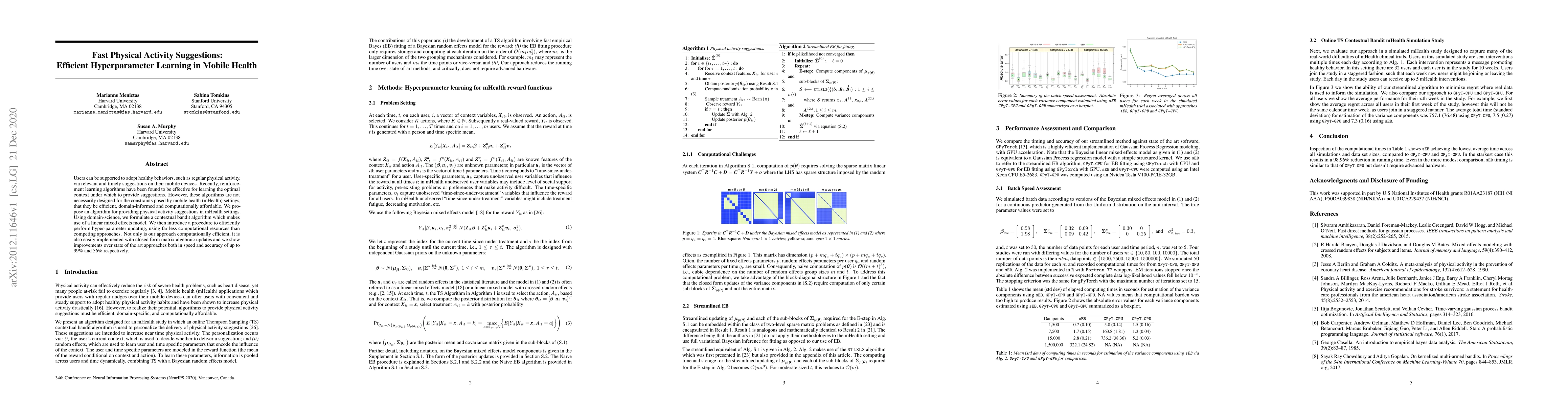Users can be supported to adopt healthy behaviors, such as regular physical activity, via relevant and timely suggestions on their mobile devices. Recently, reinforcement learning algorithms have been found to be effective for learning the optimal context under which to provide suggestions. However, these algorithms are not necessarily designed for the constraints posed by mobile health (mHealth) settings, that they be efficient, domain-informed and computationally affordable. We propose an algorithm for providing physical activity suggestions in mHealth settings. Using domain-science, we formulate a contextual bandit algorithm which makes use of a linear mixed effects model. We then introduce a procedure to efficiently perform hyper-parameter updating, using far less computational resources than competing approaches. Not only is our approach computationally efficient, it is also easily implemented with closed form matrix algebraic updates and we show improvements over state of the art approaches both in speed and accuracy of up to 99% and 56% respectively.