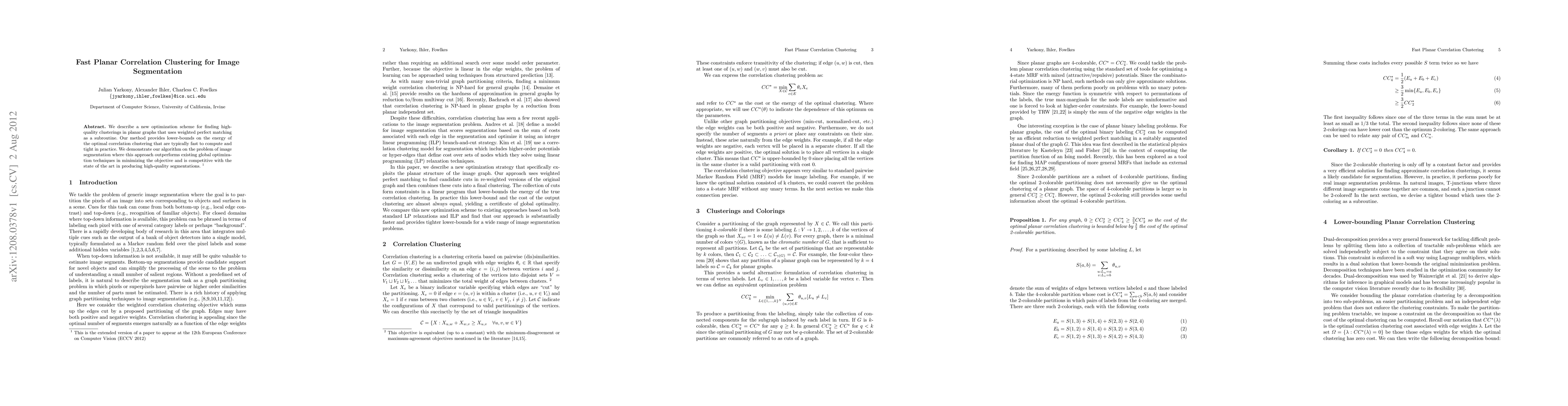 This paper introduces a fast optimization scheme for planar correlation clustering, utilizing weighted perfect matching, which efficiently computes tight lower-bounds for optimal clustering. The method is applied to image segmentation, outperforming existing global optimization techniques and competing with state-of-the-art results.