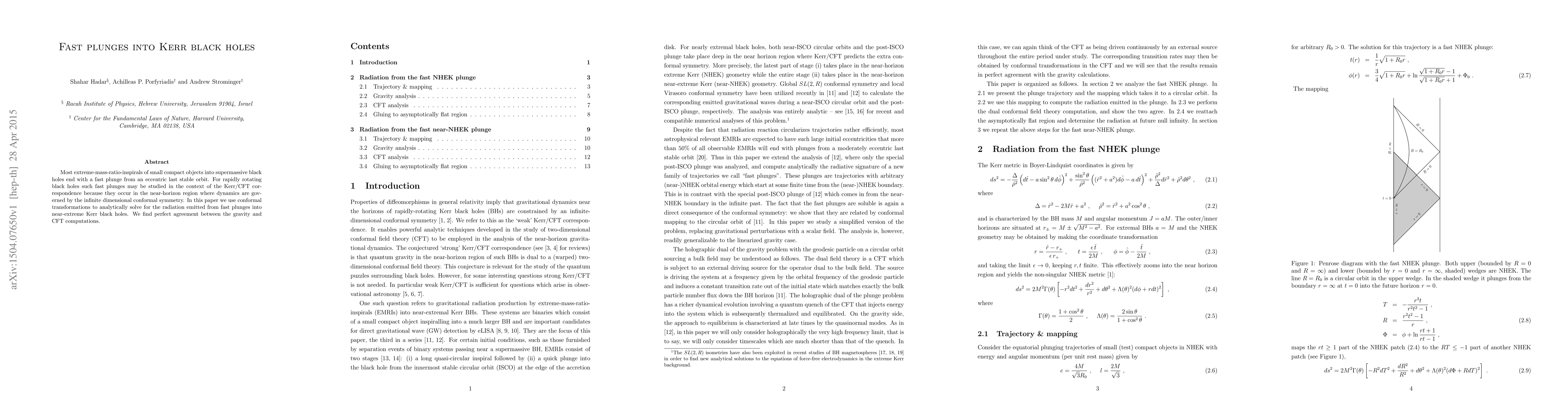 Most extreme-mass-ratio-inspirals of small compact objects into supermassive black holes end with a fast plunge from an eccentric last stable orbit. For rapidly rotating black holes such fast plunges may be studied in the context of the Kerr/CFT correspondence because they occur in the near-horizon region where dynamics are governed by the infinite dimensional conformal symmetry. In this paper we use conformal transformations to analytically solve for the radiation emitted from fast plunges into near-extreme Kerr black holes. We find perfect agreement between the gravity and CFT computations.