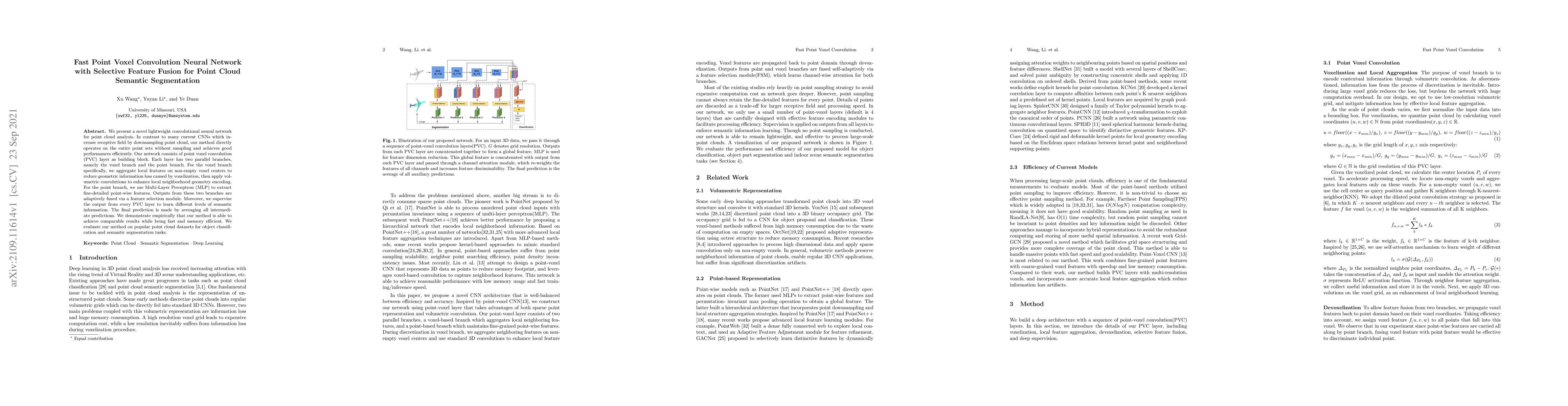 This paper introduces a lightweight convolutional neural network for point cloud analysis that operates directly on the entire point set without sampling, utilizing a point voxel convolution layer. The network combines voxel and point branches for feature extraction, adaptively fusing their outputs, and demonstrates efficient performance on object classification and semantic segmentation tasks.