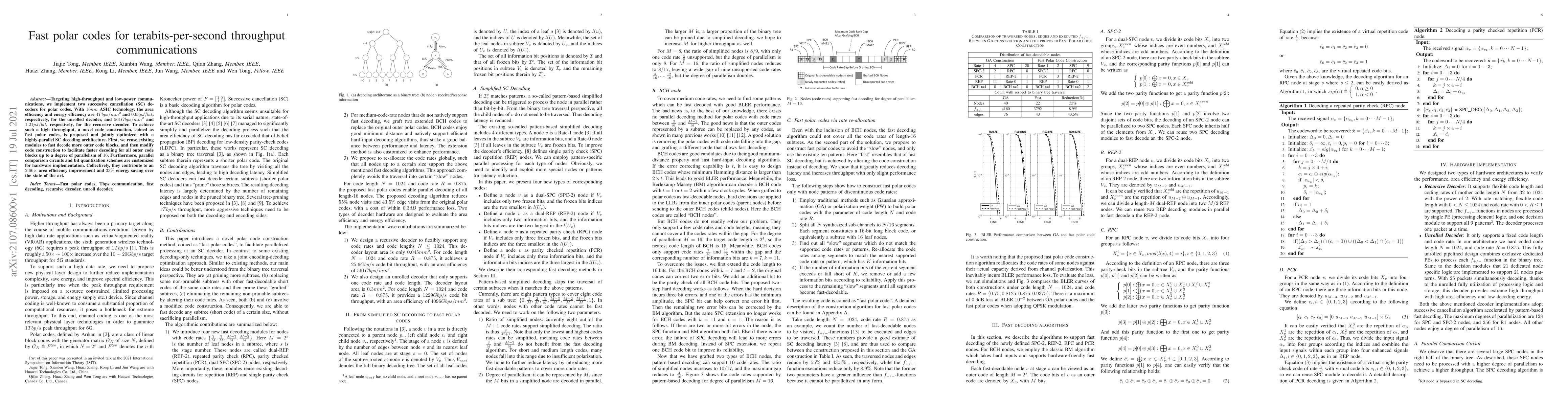 This paper proposes fast polar codes and optimized successive cancellation decoders for high-throughput, low-power communications, achieving $4Tbps/mm^2$ area efficiency and $0.63pJ/bit$ energy efficiency, outperforming existing methods by $2.66\times$ in area efficiency and $33\%$ in energy savings.