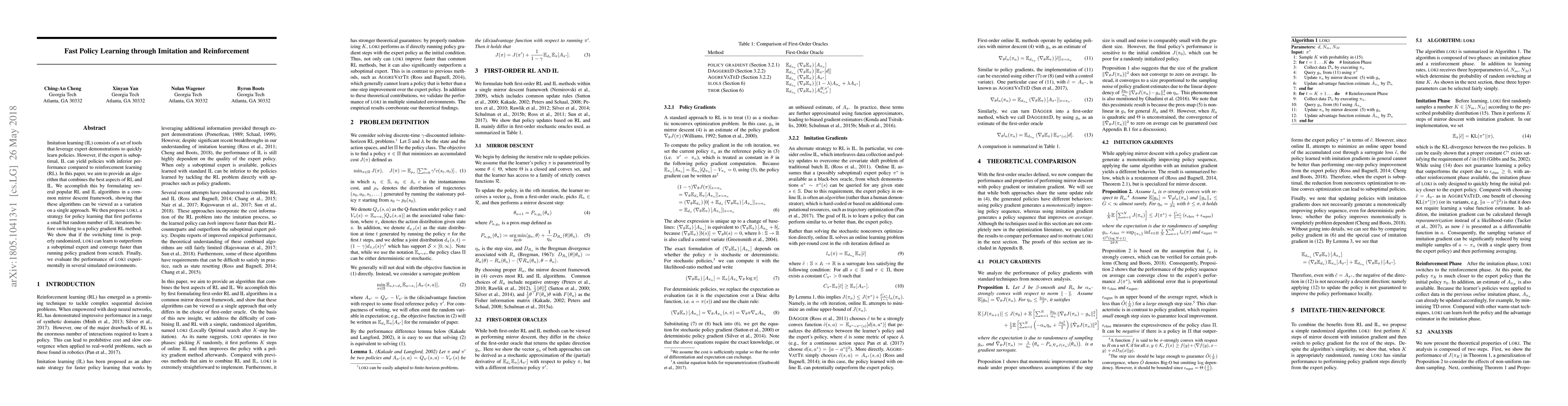 This paper proposes LOKI, an algorithm that combines imitation learning and reinforcement learning to learn policies quickly and outperform suboptimal experts. It achieves faster convergence than traditional policy gradient methods when switching between IL and RL iterations is randomized.