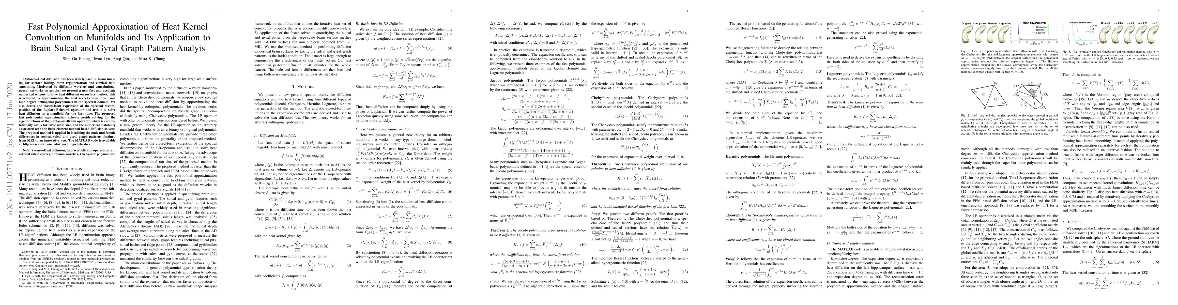 Heat diffusion has been widely used in brain imaging for surface fairing, mesh regularization and cortical data smoothing. Motivated by diffusion wavelets and convolutional neural networks on graphs, we present a new fast and accurate numerical scheme to solve heat diffusion on surface meshes. This is achieved by approximating the heat kernel convolution using high degree orthogonal polynomials in the spectral domain. We also derive the closed-form expression of the spectral decomposition of the Laplace-Beltrami operator and use it to solve heat diffusion on a manifold for the first time. The proposed fast polynomial approximation scheme avoids solving for the eigenfunctions of the Laplace-Beltrami operator, which is computationally costly for large mesh size, and the numerical instability associated with the finite element method based diffusion solvers. The proposed method is applied in localizing the male and female differences in cortical sulcal and gyral graph patterns obtained from MRI in an innovative way. The MATLAB code is available at http://www.stat.wisc.edu/~mchung/chebyshev.