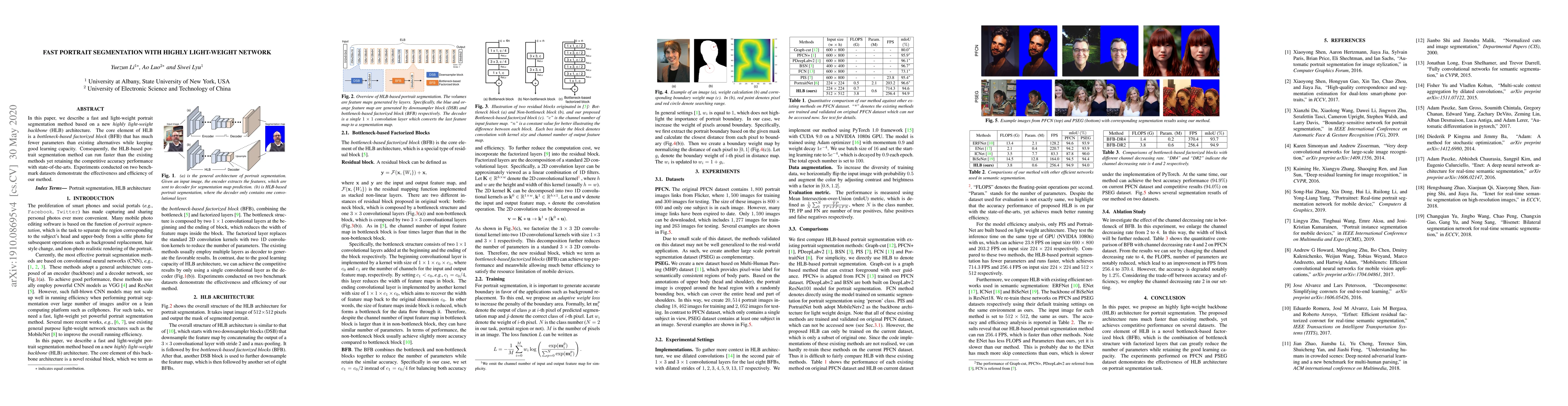 This paper proposes a fast and light-weight portrait segmentation method using a novel highly light-weight backbone (HLB) architecture with a bottleneck-based factorized block (BFB) that achieves competitive accuracy while significantly reducing computational load. Experiments show the method's efficiency and effectiveness on benchmark datasets.