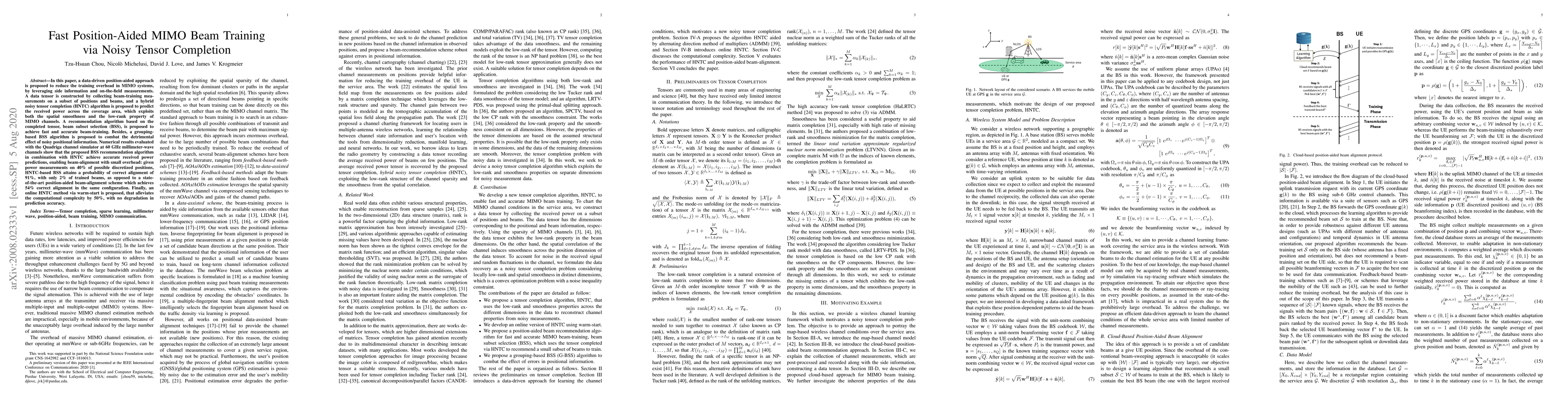 In this paper, a data-driven position-aided approach is proposed to reduce the training overhead in MIMO systems, by leveraging side information and on-the-field measurements. A data tensor is constructed by collecting beam-training measurements on a subset of positions and beams, and a hybrid noisy tensor completion (HNTC) algorithm is proposed to predict the received power across the coverage area, which exploits both the spatial smoothness and the low-rank property of MIMO channels. A recommendation algorithm based on the completed tensor, beam subset selection (BSS), is proposed to achieve fast and accurate beam-training. Besides, a grouping-based BSS algorithm is proposed to combat the detrimental effect of noisy positional information. Numerical results evaluated with the Quadriga channel simulator at 60 GHz millimeter-wave channels show that the proposed BSS recommendation algorithm in combination with HNTC achieve accurate received power predictions, enabling beam-alignment with small overhead: given power measurements on 40% of possible discretized positions, HNTC-based BSS attains a probability of correct alignment of 91%, with only 2% of trained beams, as opposed to a state-of-the-art position-aided beam-alignment scheme which achieves 54% correct alignment in the same configuration. Finally, an online HNTC method via warm-start is proposed, that alleviates the computational complexity by 50%, with no degradation in prediction accuracy.