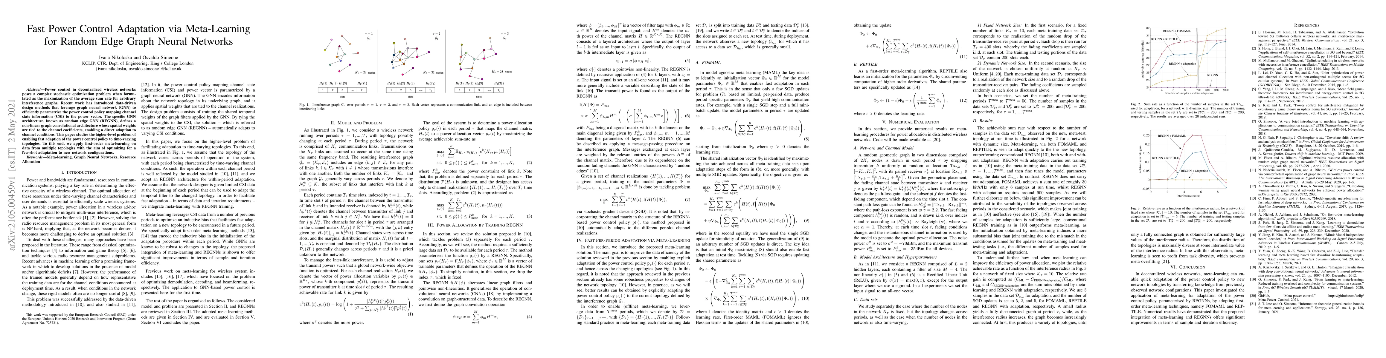 Power control in decentralized wireless networks poses a complex stochastic optimization problem when formulated as the maximization of the average sum rate for arbitrary interference graphs. Recent work has introduced data-driven design methods that leverage graph neural network (GNN) to efficiently parametrize the power control policy mapping channel state information (CSI) to the power vector. The specific GNN architecture, known as random edge GNN (REGNN), defines a non-linear graph convolutional architecture whose spatial weights are tied to the channel coefficients, enabling a direct adaption to channel conditions. This paper studies the higher-level problem of enabling fast adaption of the power control policy to time-varying topologies. To this end, we apply first-order meta-learning on data from multiple topologies with the aim of optimizing for a few-shot adaptation to new network configurations.