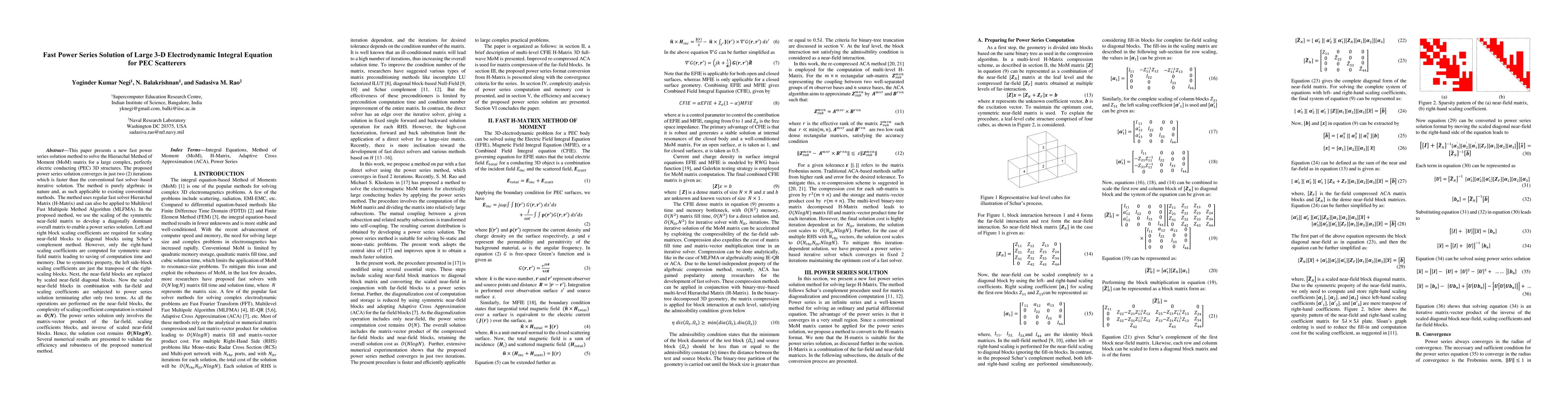 A new fast power series solution method is proposed to solve large 3D electrodynamic integral equations for perfectly electric conducting structures, achieving convergence in just two iterations and reducing computation time and memory usage.