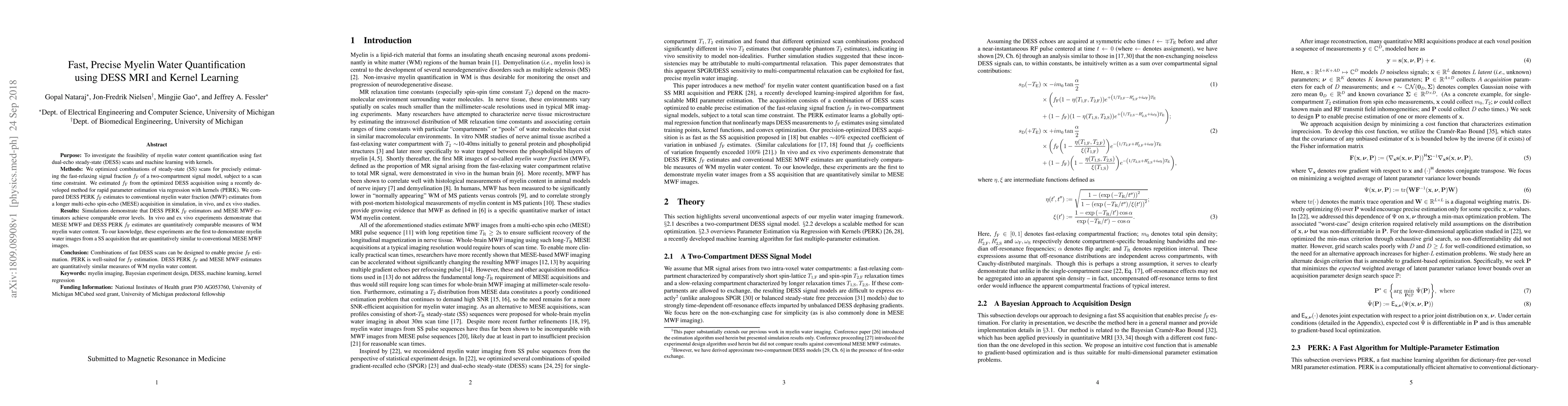 This study demonstrates the feasibility of using fast dual-echo steady-state (DESS) MRI scans combined with kernel learning to precisely quantify myelin water content, achieving results comparable to conventional multi-echo spin-echo (MESE) methods. The proposed DESS PERK method provides a rapid alternative for myelin water imaging.