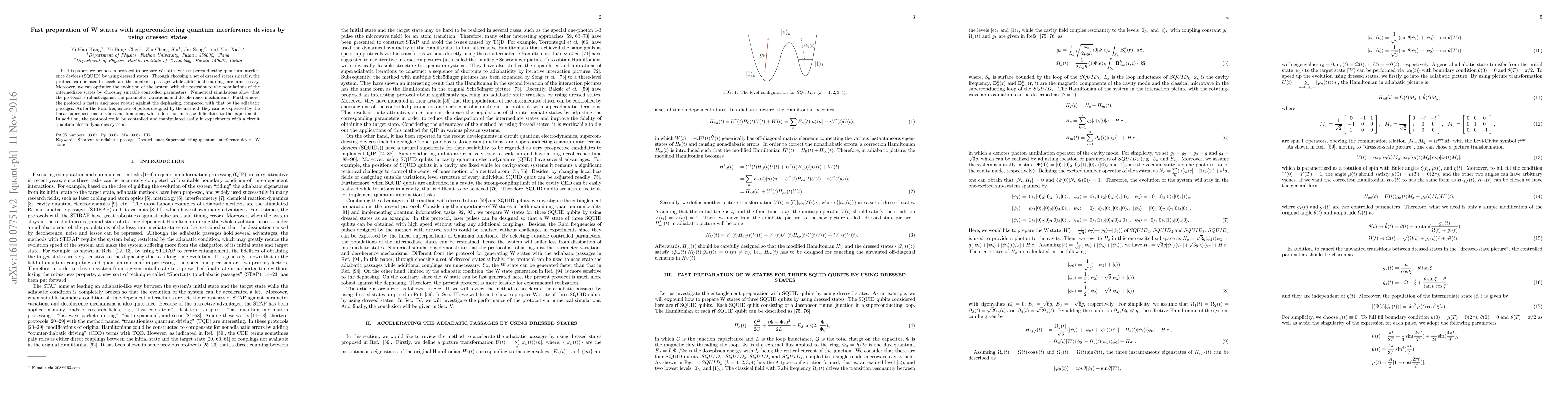 In this paper, we propose a protocol to prepare W states with superconducting quantum interference devices (SQUID) by using dressed states. Through choosing a set of dressed states suitably, the protocol can be used to accelerate the adiabatic passages while additional couplings are unnecessary. Moreover, we can optimize the evolution of the system with the restraint to the populations of the intermediate states by choosing suitable controlled parameters. Numerical simulations show that the protocol is robust against the parameter variations and decoherence mechanisms. Furthermore, the protocol is faster and more robust against the dephasing, compared with that by the adiabatic passages. As for the Rabi frequencies of pulses designed by the method, they can be expressed by the linear superpositions of Gaussian functions, which does not increase difficulties to the experiments. In addition, the protocol could be controlled and manipulated easily in experiments with a circuit quantum electrodynamics system.