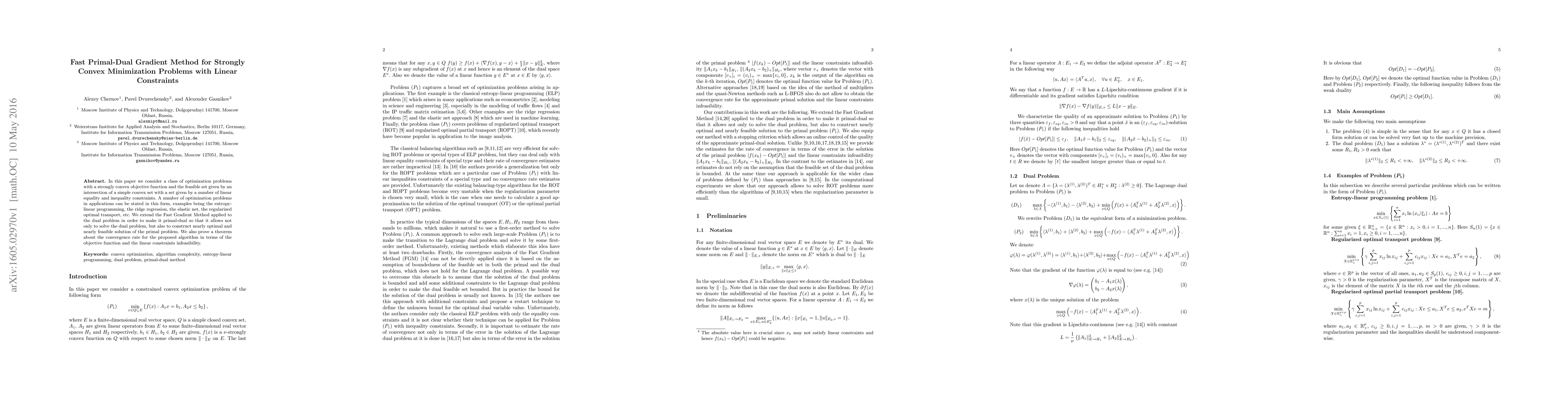 In this paper we consider a class of optimization problems with a strongly convex objective function and the feasible set given by an intersection of a simple convex set with a set given by a number of linear equality and inequality constraints. A number of optimization problems in applications can be stated in this form, examples being the entropy-linear programming, the ridge regression, the elastic net, the regularized optimal transport, etc. We extend the Fast Gradient Method applied to the dual problem in order to make it primal-dual so that it allows not only to solve the dual problem, but also to construct nearly optimal and nearly feasible solution of the primal problem. We also prove a theorem about the convergence rate for the proposed algorithm in terms of the objective function and the linear constraints infeasibility.