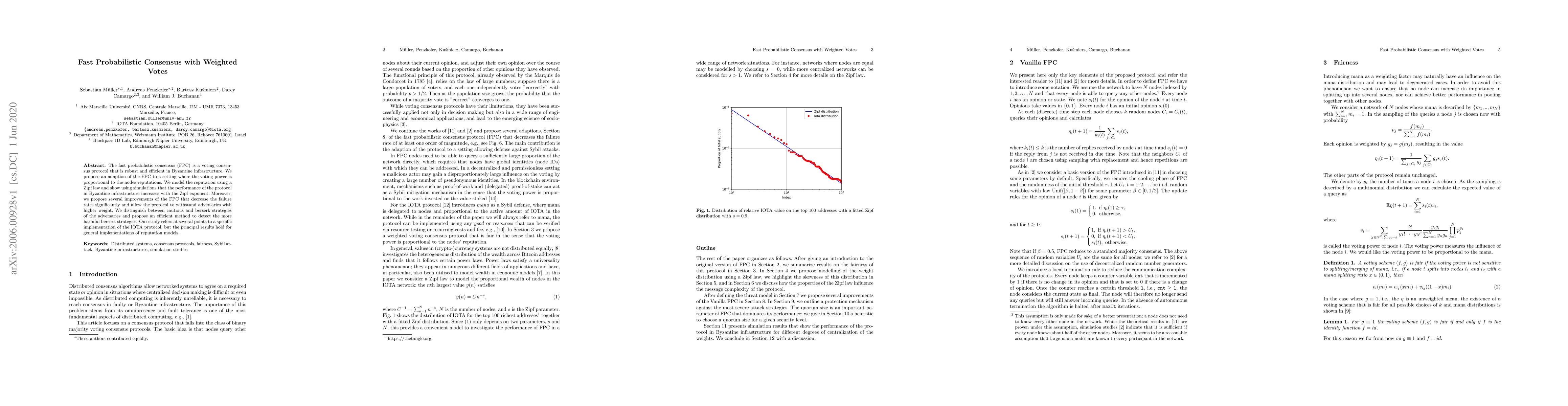 The fast probabilistic consensus (FPC) is a voting consensus protocol that is robust and efficient in Byzantine infrastructure. We propose an adaption of the FPC to a setting where the voting power is proportional to the nodes reputations. We model the reputation using a Zipf law and show using simulations that the performance of the protocol in Byzantine infrastructure increases with the Zipf exponent. Moreover, we propose several improvements of the FPC that decrease the failure rates significantly and allow the protocol to withstand adversaries with higher weight. We distinguish between cautious and berserk strategies of the adversaries and propose an efficient method to detect the more harmful berserk strategies. Our study refers at several points to a specific implementation of the IOTA protocol, but the principal results hold for general implementations of reputation models.
