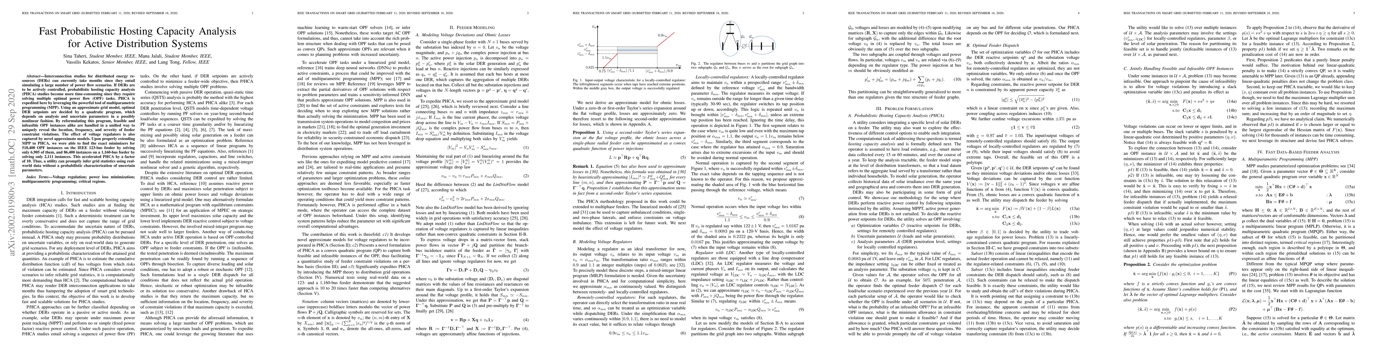 Interconnection studies for distributed energy resources (DERs) can currently take months since they entail simulating a large number of power flow scenarios. If DERs are to be actively controlled, probabilistic hosting capacity analysis (PHCA) studies become more time-consuming since they require solving multiple optimal power flow (OPF) tasks. PHCA is expedited here by leveraging the powerful tool of multiparametric programming (MPP). Using an approximate grid model, optimal DER setpoints are decided by a quadratic program, which depends on analysis and uncertain parameters in a possibly nonlinear fashion. By reformulating this program, feasible and infeasible OPF instances alike are handled in a unified way to uniquely reveal the location, frequency, and severity of feeder constraint violations. The effect of voltage regulators is also captured by novel approximate models. Upon properly extending MPP to PHCA, we were able to find the exact minimizers for 518,400 OPF instances on the IEEE 123-bus feeder by solving only 6,905 of them, and 86,400 instances on a 1,160-bus feeder by solving only 2,111 instances. This accelerated PHCA by a factor of 10. Thus, a utility can promptly infer grid statistics using real-world data without a probabilistic characterization of uncertain parameters.